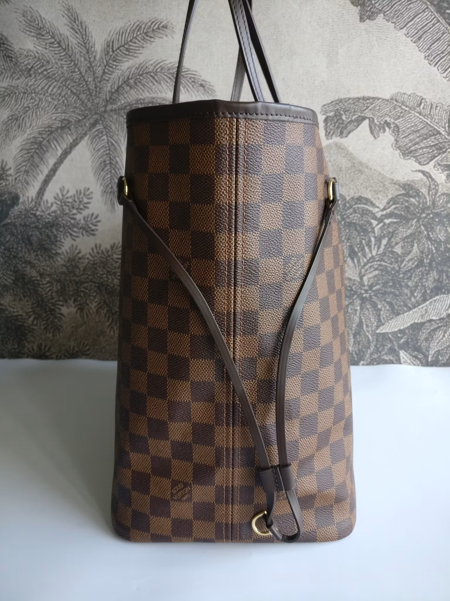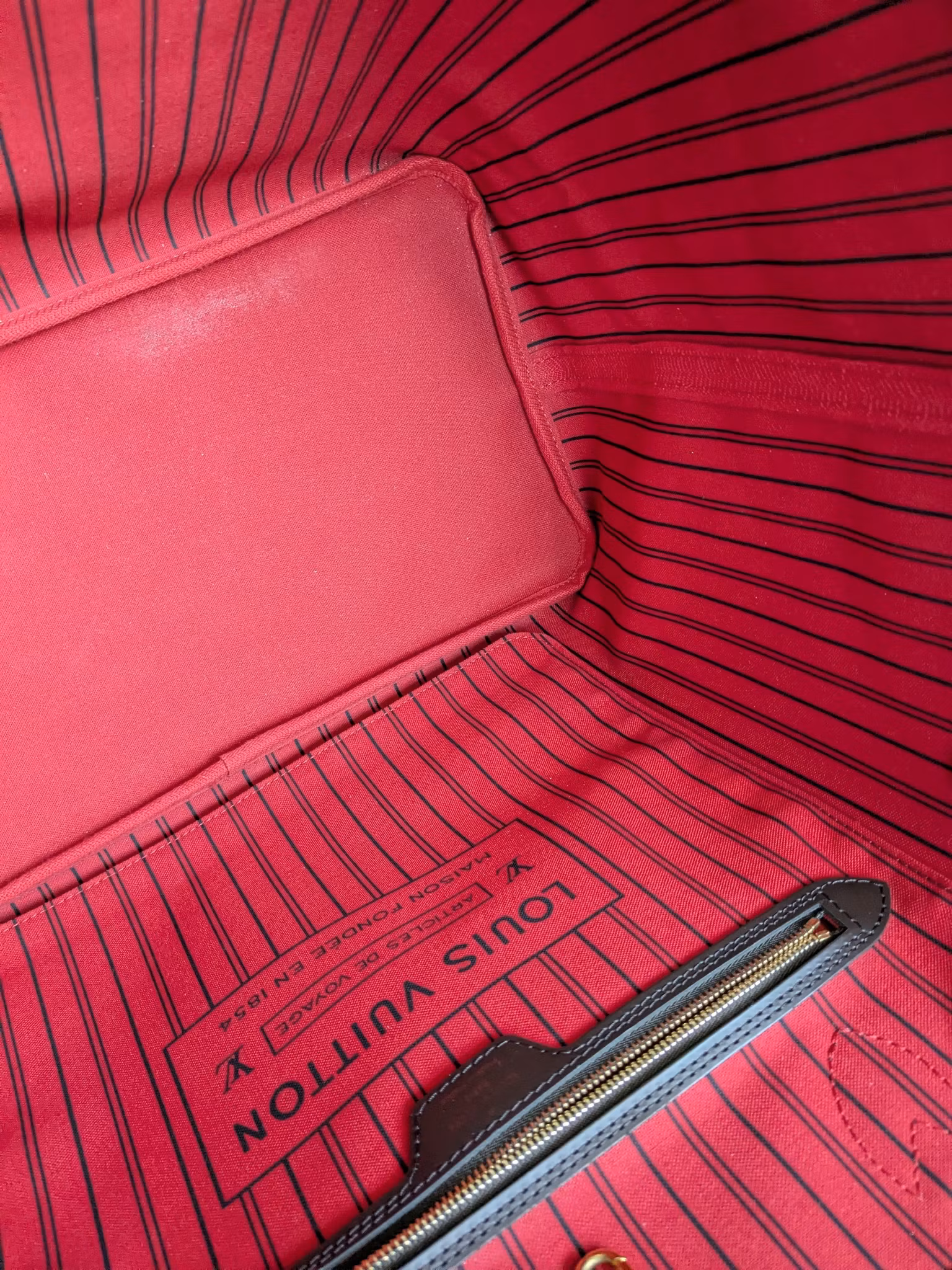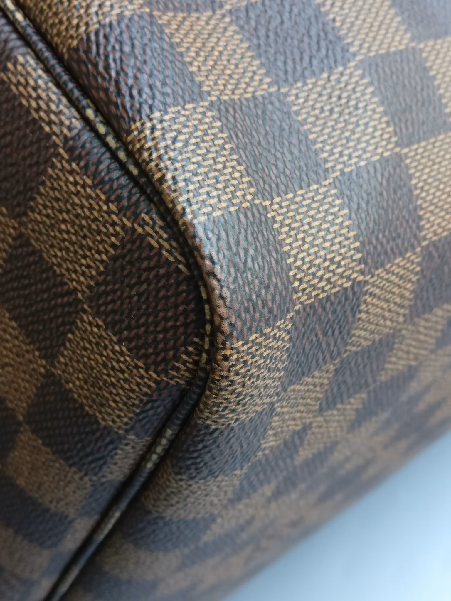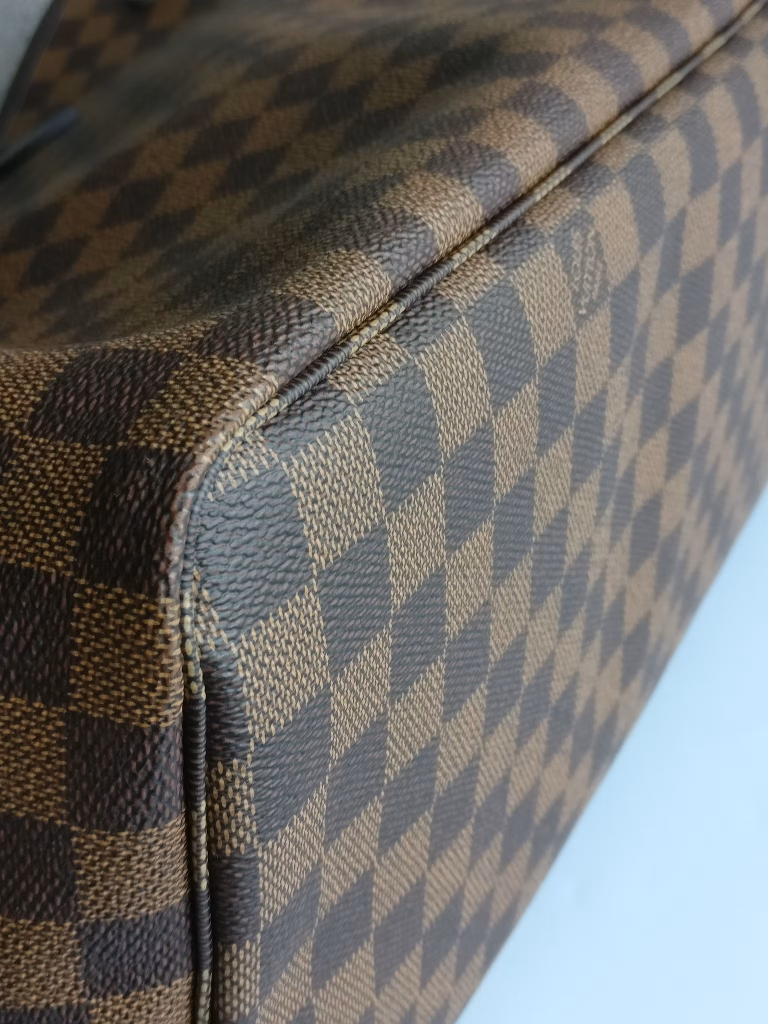 Neverfull GM från 2022 i mycket fint skick, med mindre bruksspår. Damier ebene canvas i mycket fint skick, botten är fin, nedre hörn med minimala bruksspår. Gold hardware i gott skick med fin glans. Handtagen är stadiga och i fint skick med minimala bruksspår. Övre läderkanten i fint skick med minimala bruksspår. Insidan är ren med ett ljust märke i botten. Ingen doft i väskan. Lilla extrafickan i gott skick, dragkedjan fungerar fint. Kommer med LV box (skador på boxen), dust bag, originalkvitto, äkthetsintyg, organizer. Ingen clutch. Nypris idag hos Louis Vuitton är 19.300:-