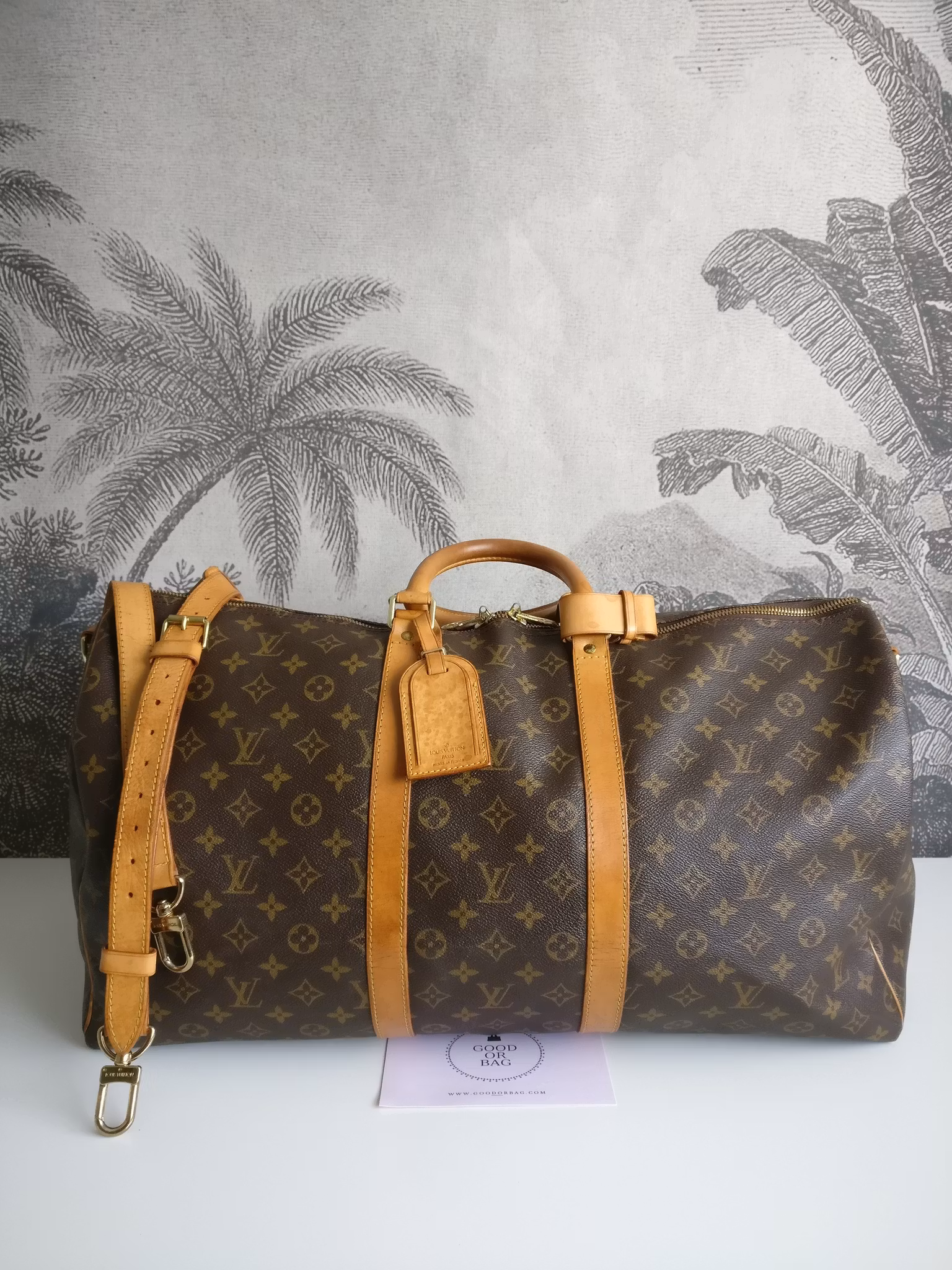 CONDITION/DESCRIPTION: Keepall bandouliere 55 in acceptable vintage condition, with visible signs of wear. Monogram canvas is in good condition. Vachetta parts have a medium honey patina, with water spots, marks and dryness on the leather parts and the leather straps that run around the bag, spots and marks on the handles which are sturdy. Removable and adjustable shoulder strap with dryness, water spots and stains. The leather tabs where the shoulder strap can be attach have dry cracks. The zippers work well. Inside is clean with some signs of wear in the lining, no vintage odor inside. Price new at Louis Vuitton today is 27.200:- SEK. Comes with removable and adjustable shoulder strap, address tag, poignet (handle holder) and certificate of authenticity