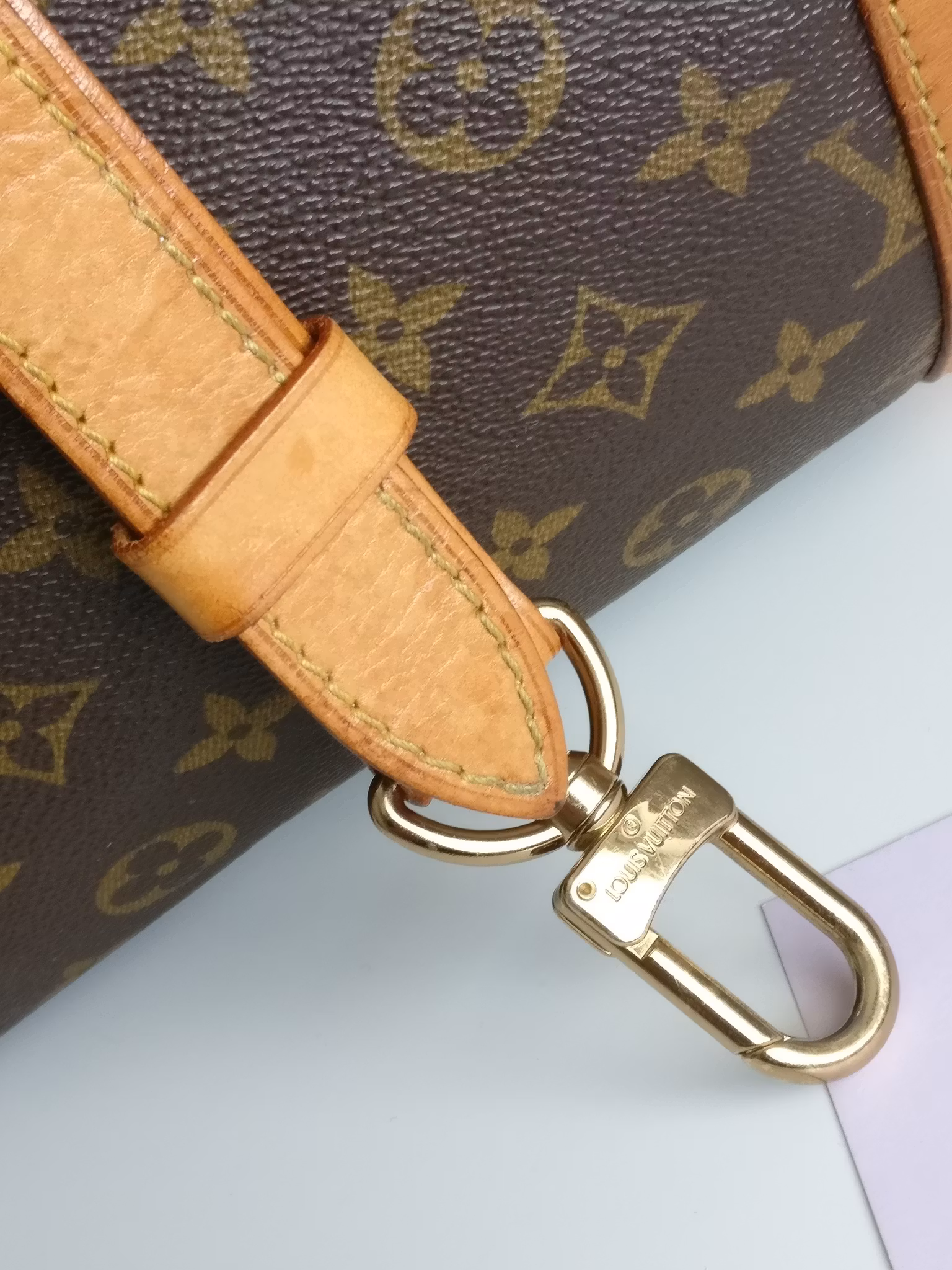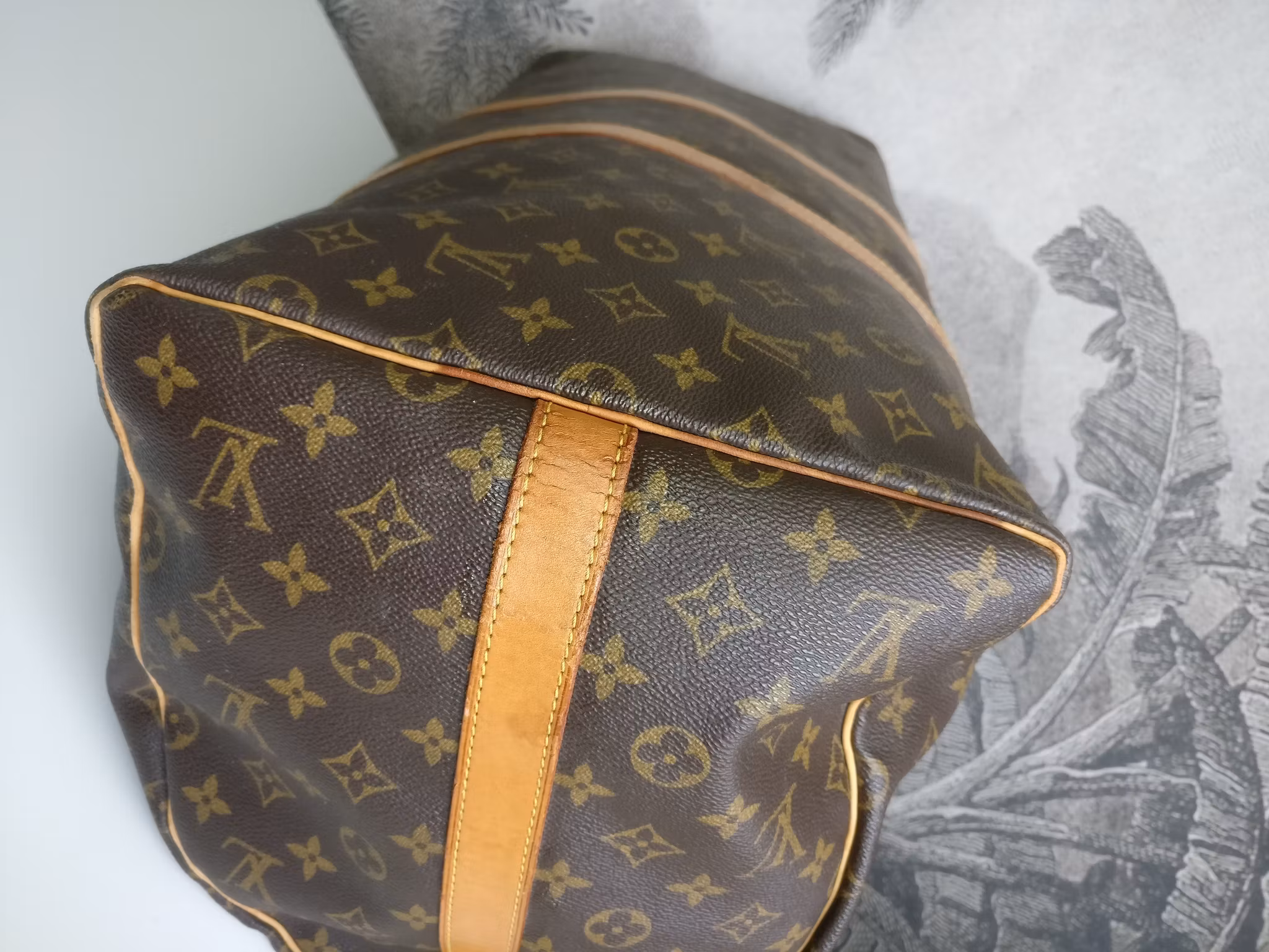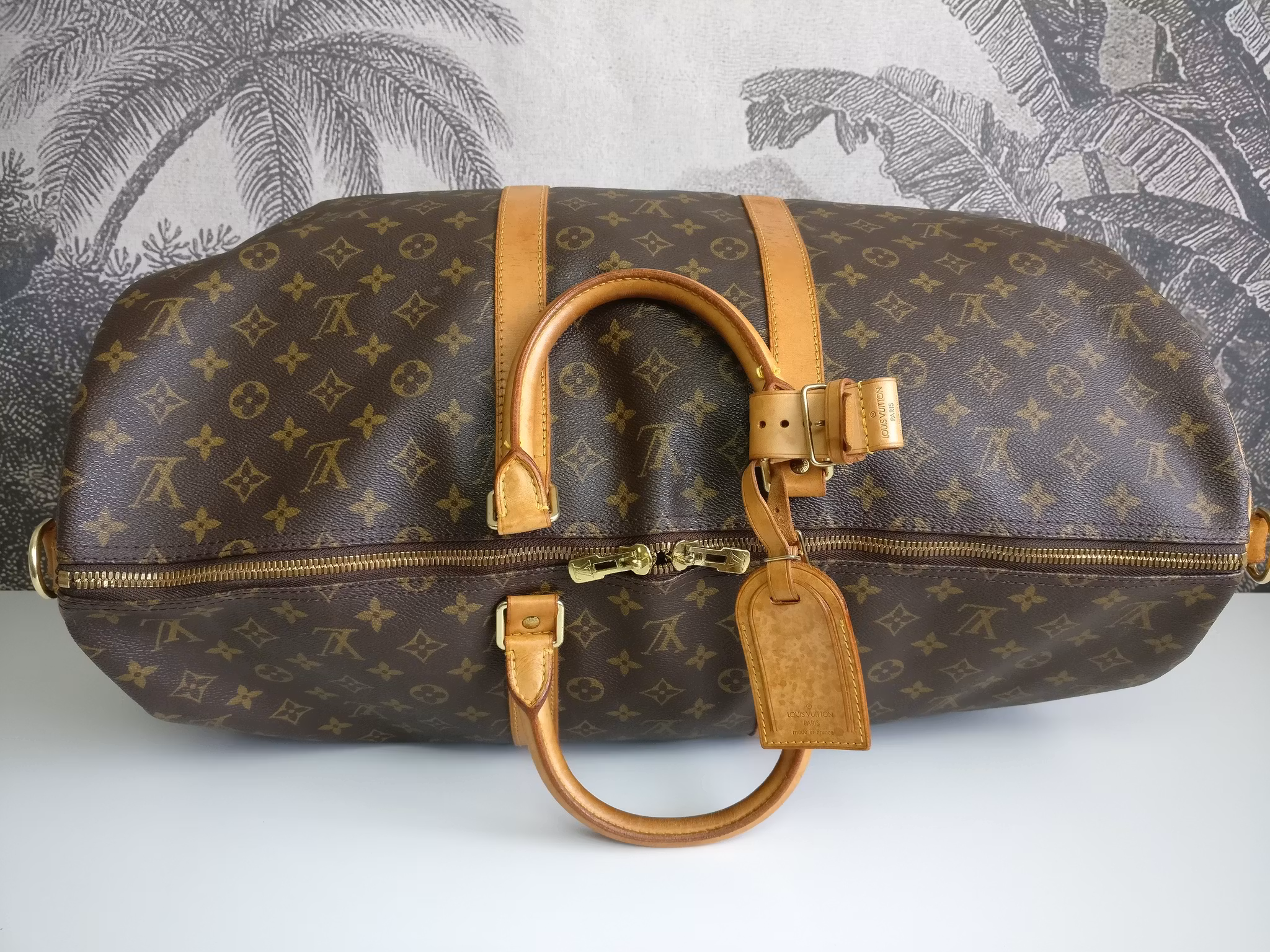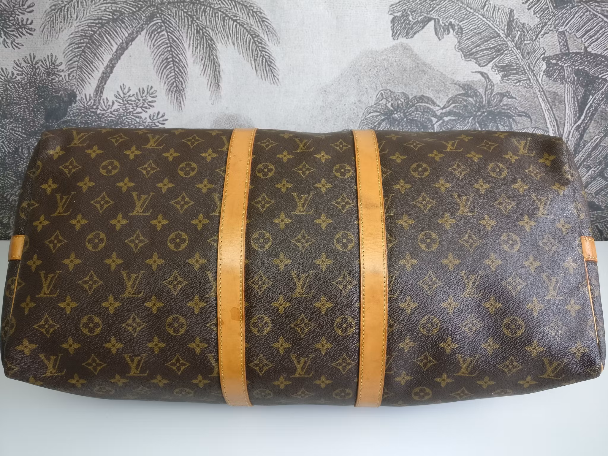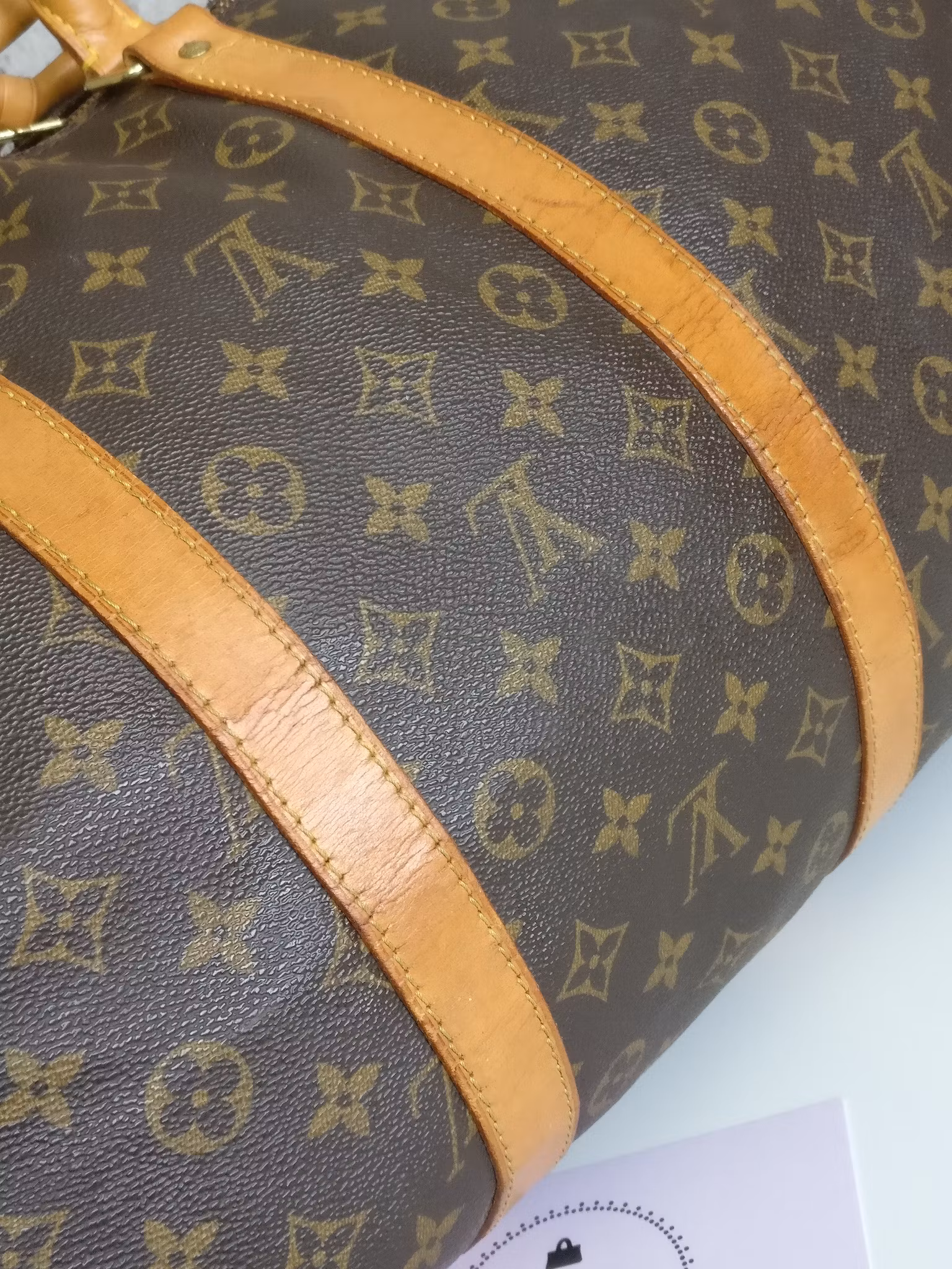 Keepall bandouliere 55 i acceptabelt vintageskick, med synliga bruksspår på vachettan. Monogram canvas är i fint skick. Vachettan har en medium honungspatina. Vattenfläckar, torrarhet och märken finns på läderdelarna och revärerna som löper runtmed väskan. Handtagen är stadiga med bruksspår och märken. Avtagbart justerbart axelband i med fläckar och torrhet. Läderflärparna där axelbandet fästs har torrsprickor. Dragkedjorna fungerar fint. Insidan är ren med mindre bruksspår i fodret. Ingen doft i väskan. Kommer med avtagbar axelrem, adresstag samt handtagshållare (poignet) och äkthetsintyg. Nypris idag hos Louis Vuitton är 27.200:- SEK.