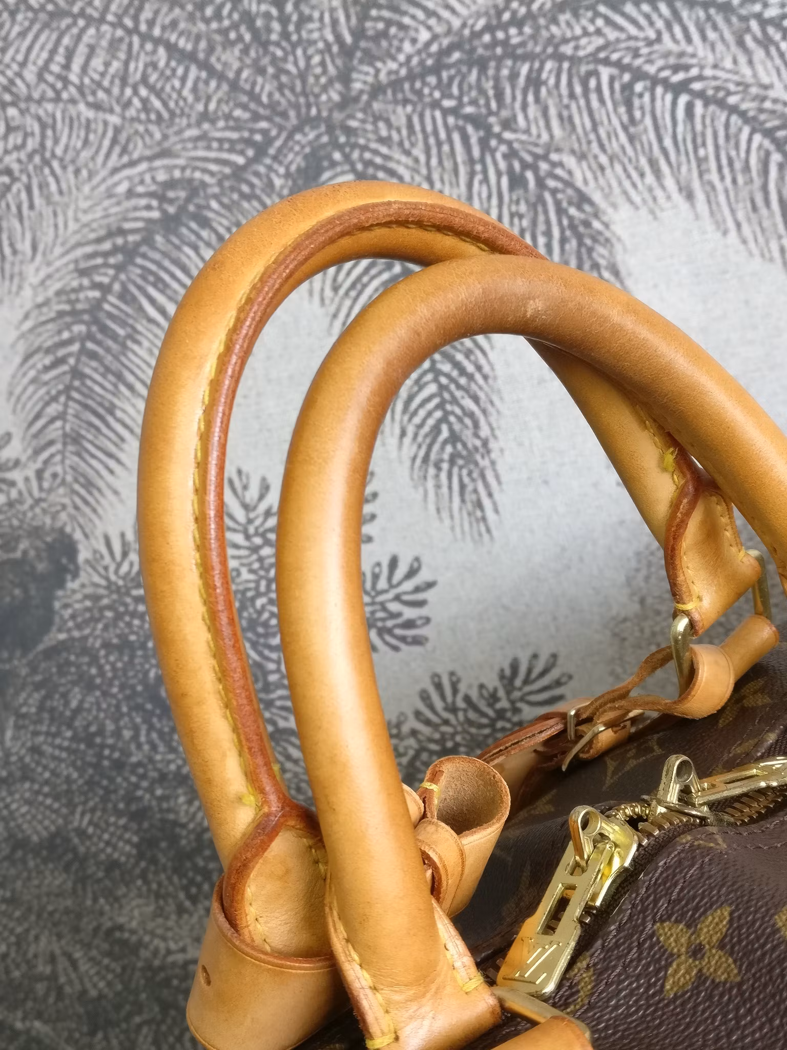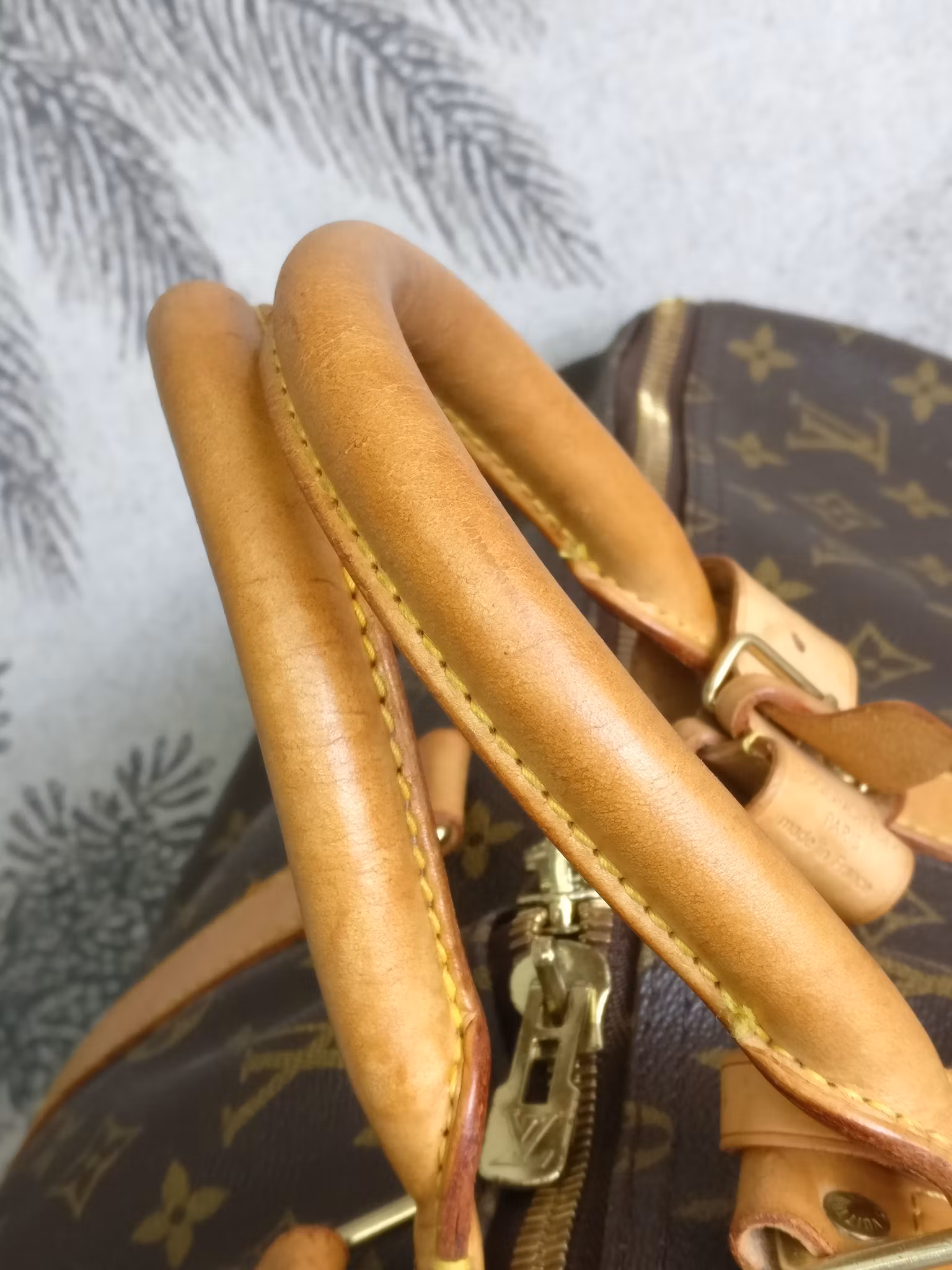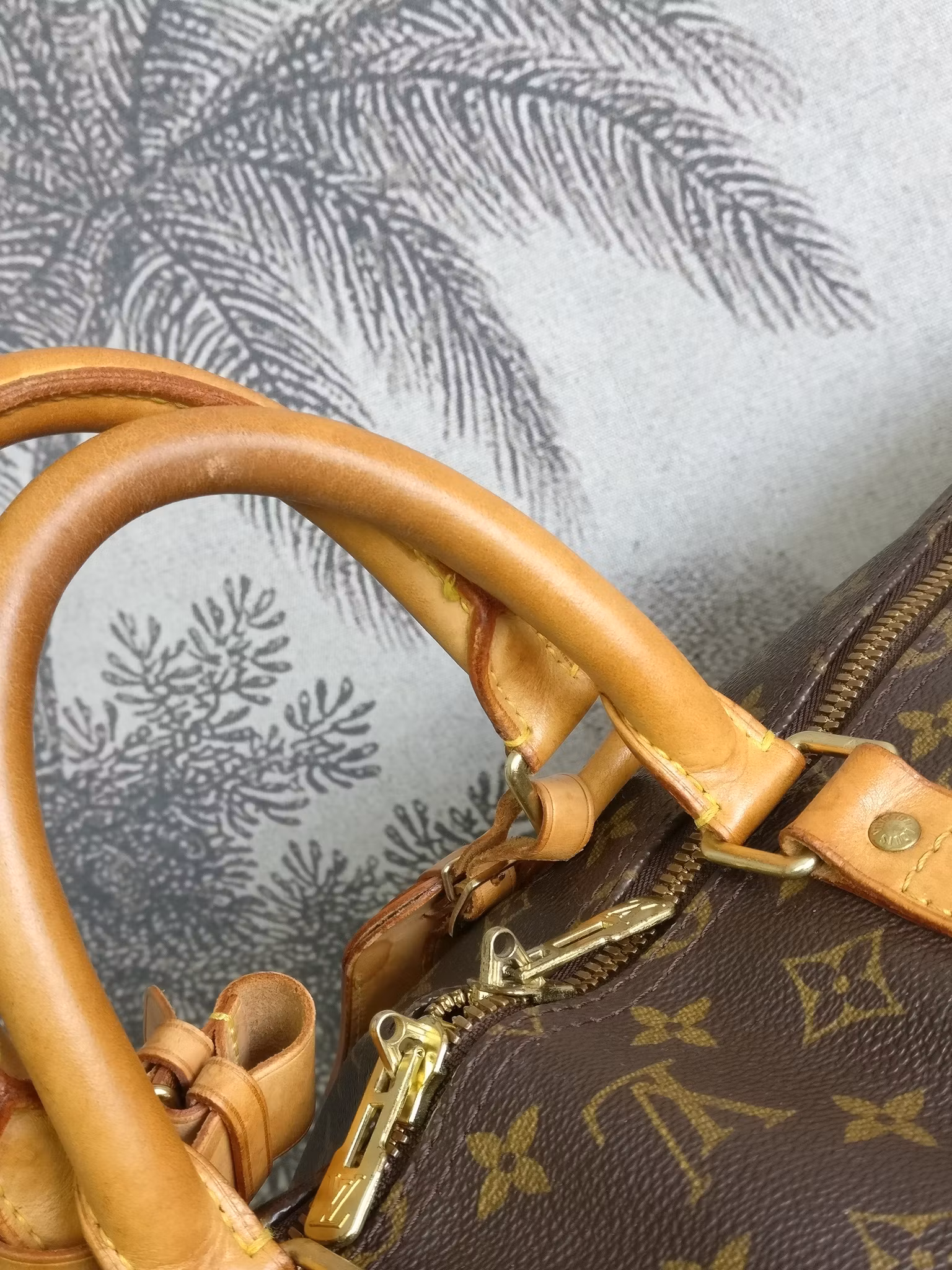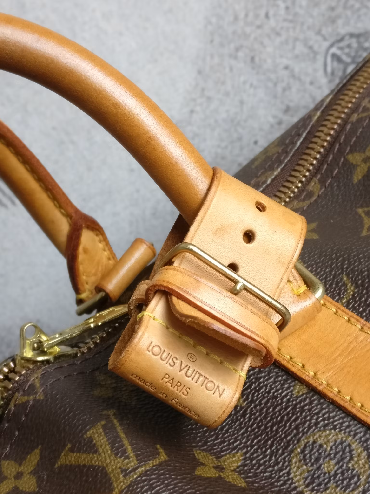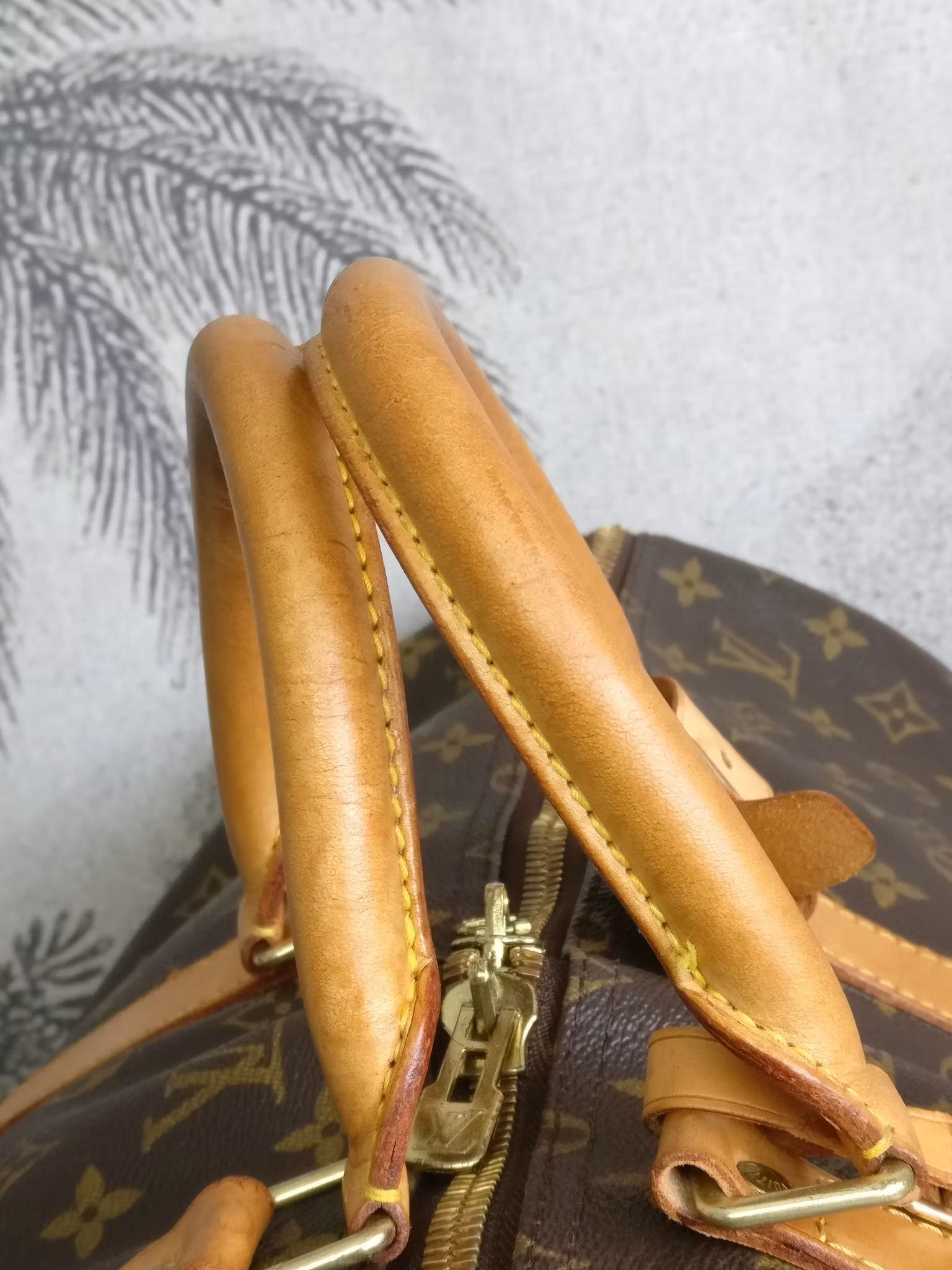 Keepall bandouliere 55 i acceptabelt vintageskick, med synliga bruksspår på vachettan. Monogram canvas är i fint skick. Vachettan har en medium honungspatina. Vattenfläckar, torrarhet och märken finns på läderdelarna och revärerna som löper runtmed väskan. Handtagen är stadiga med bruksspår och märken. Avtagbart justerbart axelband i med fläckar och torrhet. Läderflärparna där axelbandet fästs har torrsprickor. Dragkedjorna fungerar fint. Insidan är ren med mindre bruksspår i fodret. Ingen doft i väskan. Kommer med avtagbar axelrem, adresstag samt handtagshållare (poignet) och äkthetsintyg. Nypris idag hos Louis Vuitton är 27.200:- SEK.