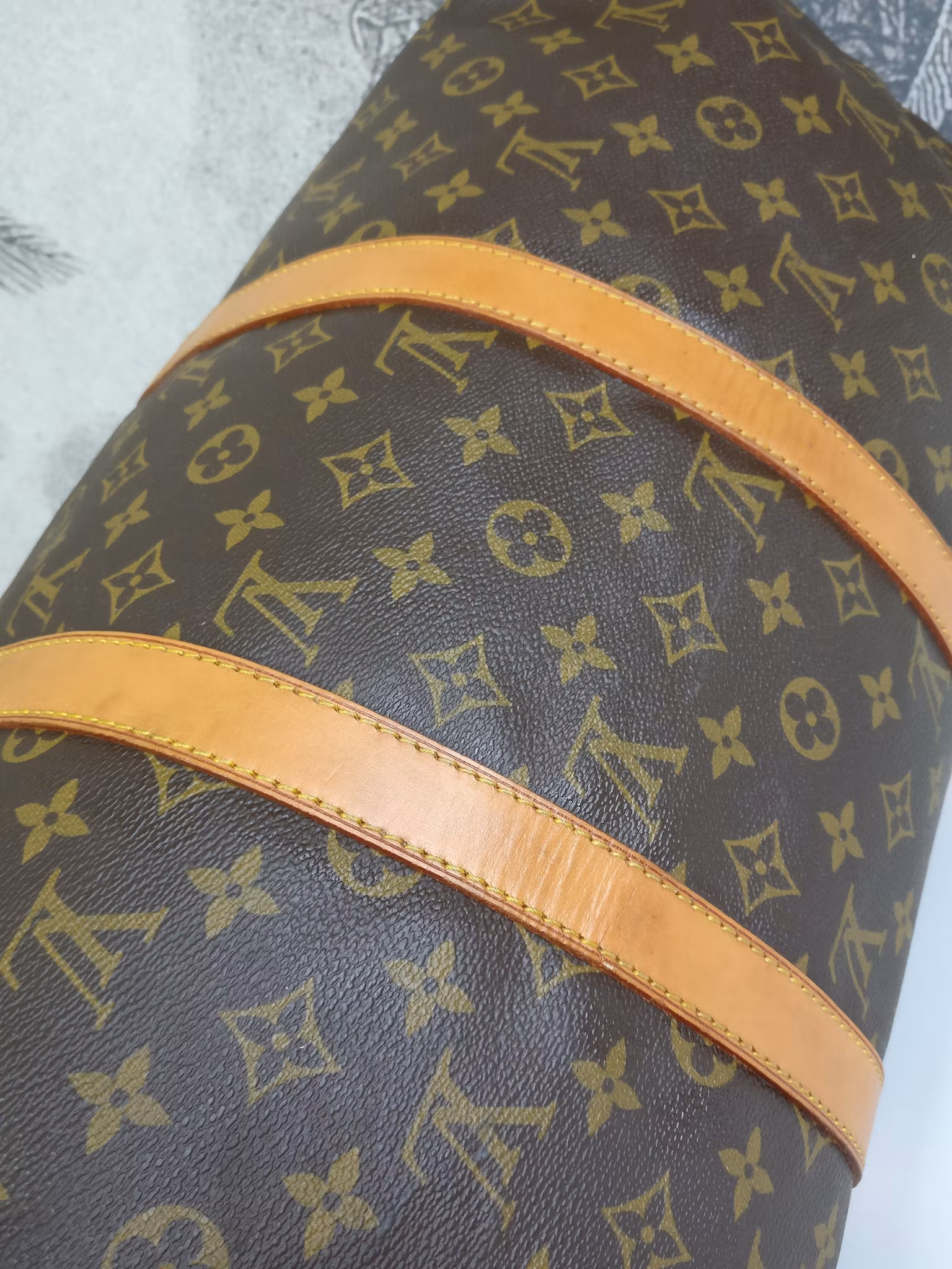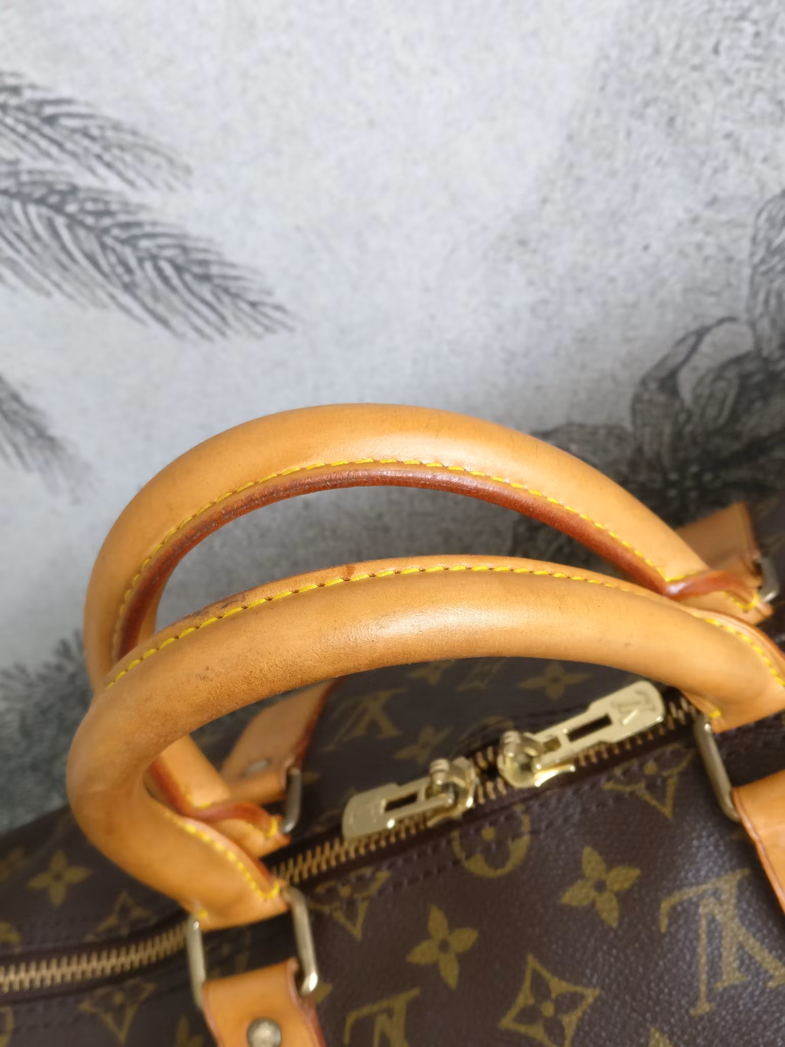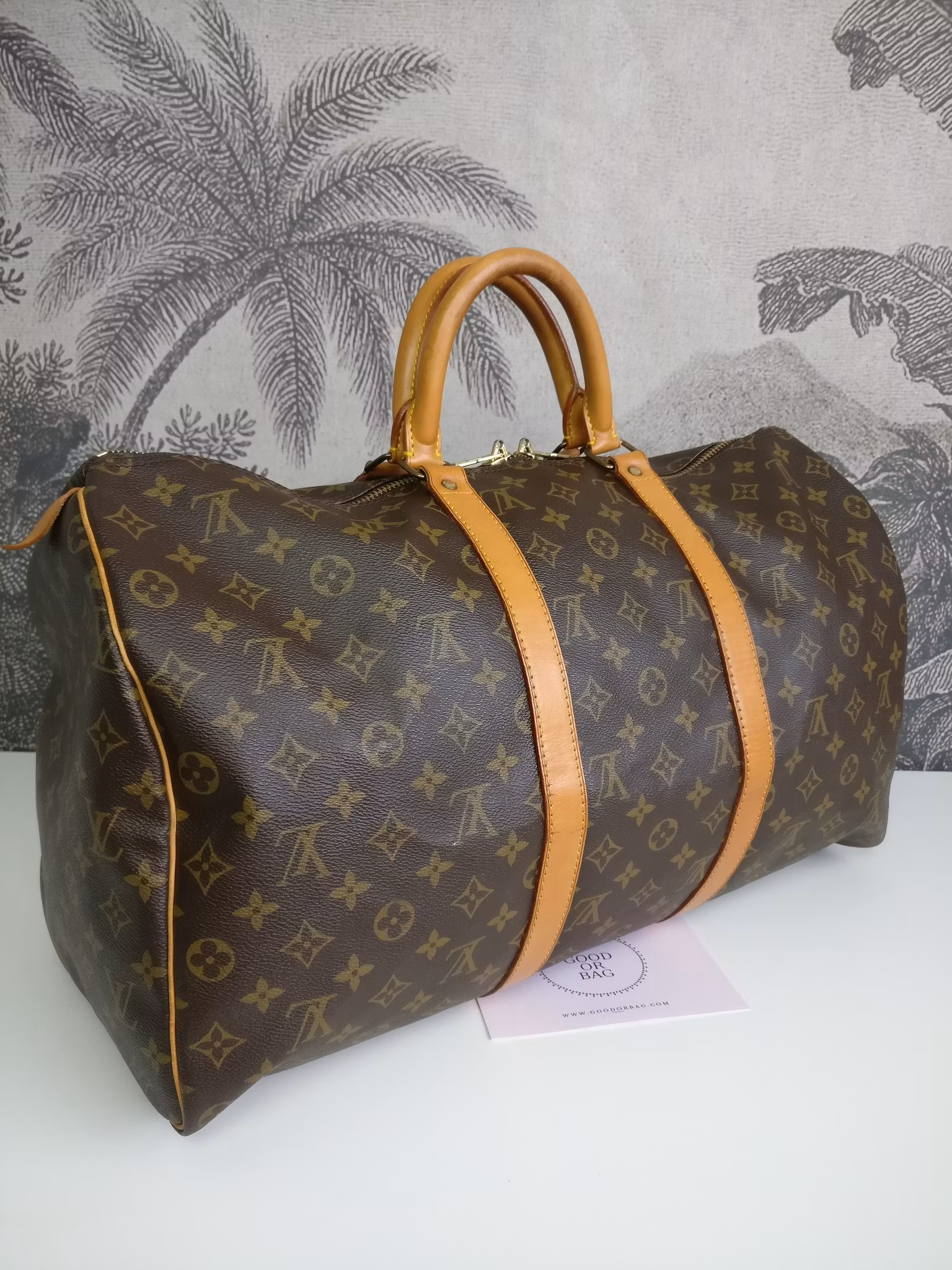 Keepall 50 weekend bag in good vintage condition, with signs of wear. Monogram canvas in good condition, soft with a beautiful shine with a couple of marks. Corners in good condition with small signs of wear. Vachetta leather has a medium honey patina and is generally well taken care of with a nice shine, with signs of wear such as spots, marks, dryness and occasional small dry cracks. The handles are sturdy with with spots and marks. Gold hardware generally in good condition. The zipper runs smoothly, usually on Keepalls one of the zippers is a bit tougher than the other and this is the case for this bag as well. Inside is generally clean with a few minimal marks. There is a moderate vintage odor in the bag.