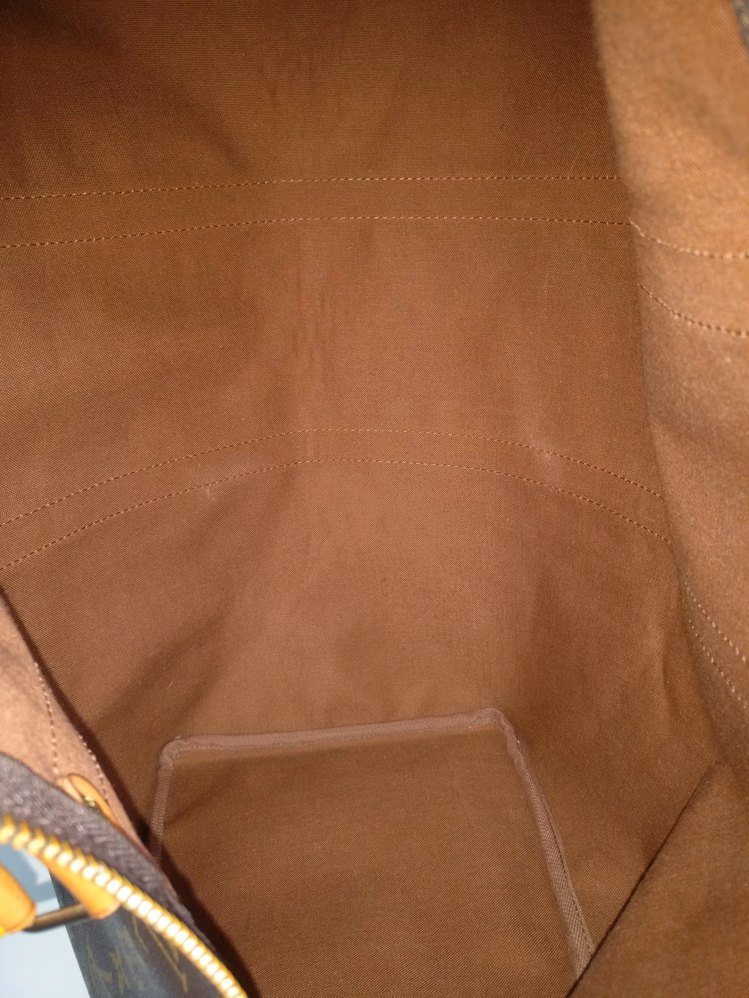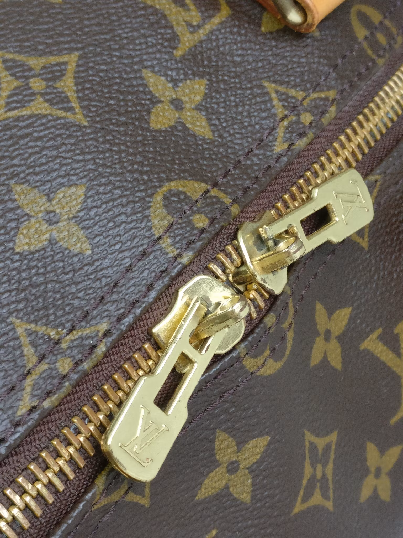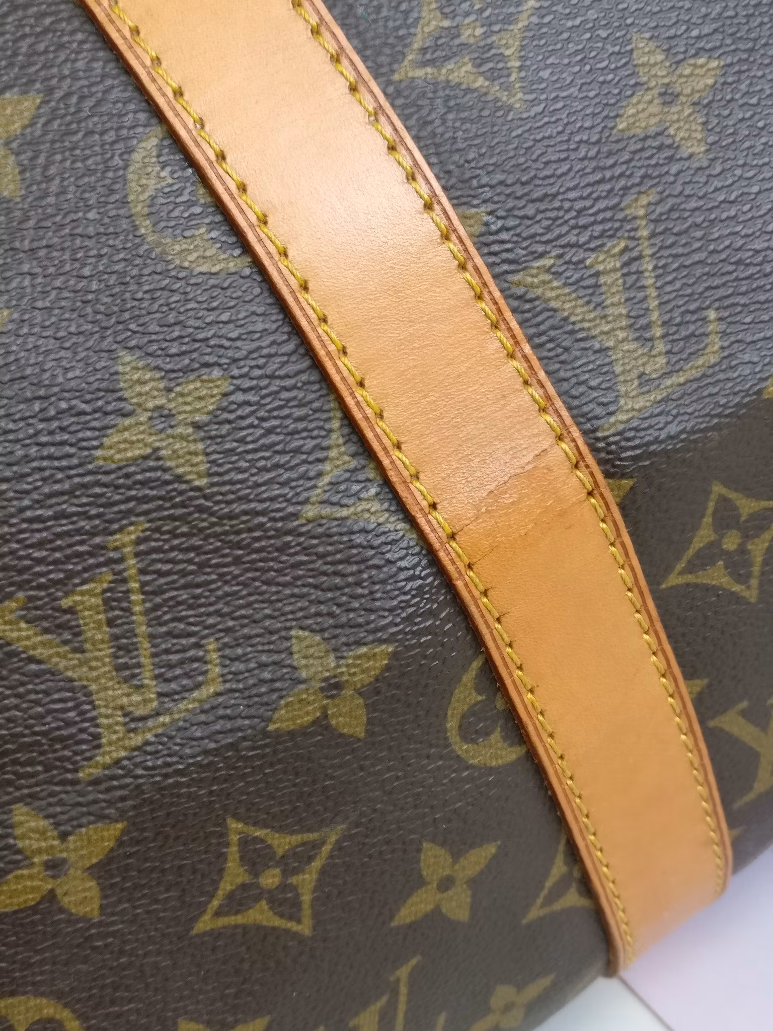 Keepall 50 weekend bag in good vintage condition, with signs of wear. Monogram canvas in good condition, soft with a beautiful shine with a couple of marks. Corners in good condition with small signs of wear. Vachetta leather has a medium honey patina and is generally well taken care of with a nice shine, with signs of wear such as spots, marks, dryness and occasional small dry cracks. The handles are sturdy with with spots and marks. Gold hardware generally in good condition. The zipper runs smoothly, usually on Keepalls one of the zippers is a bit tougher than the other and this is the case for this bag as well. Inside is generally clean with a few minimal marks. There is a moderate vintage odor in the bag.