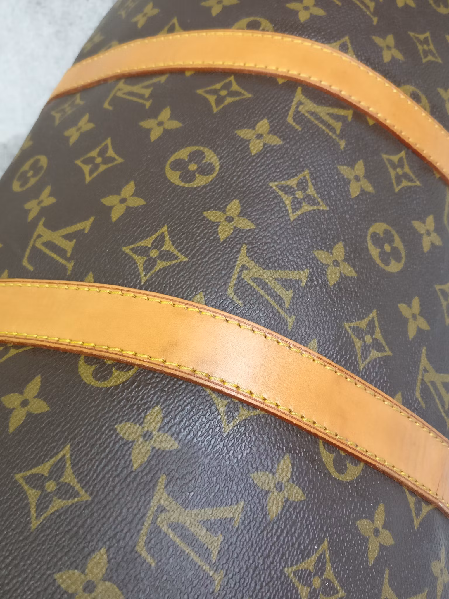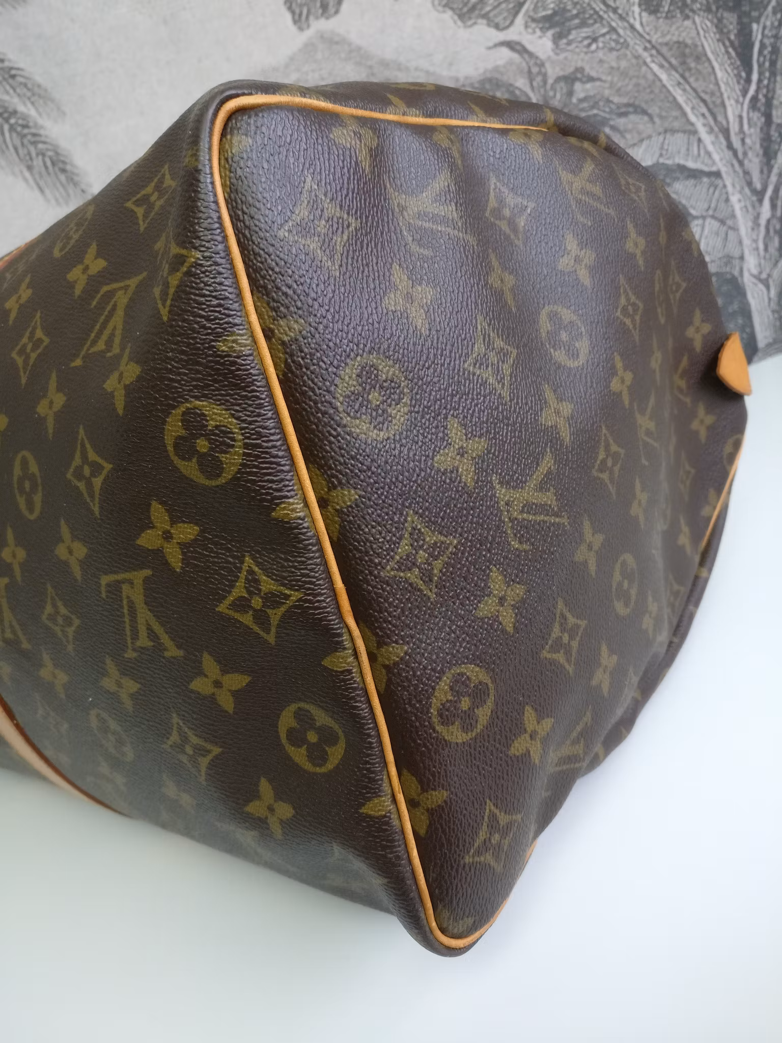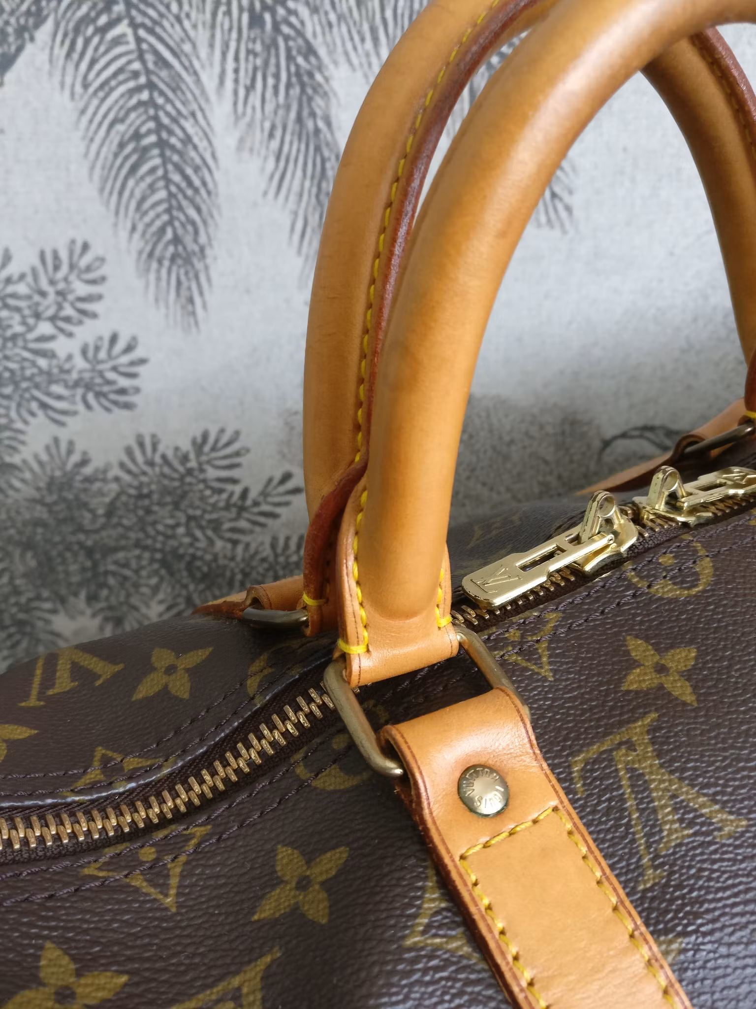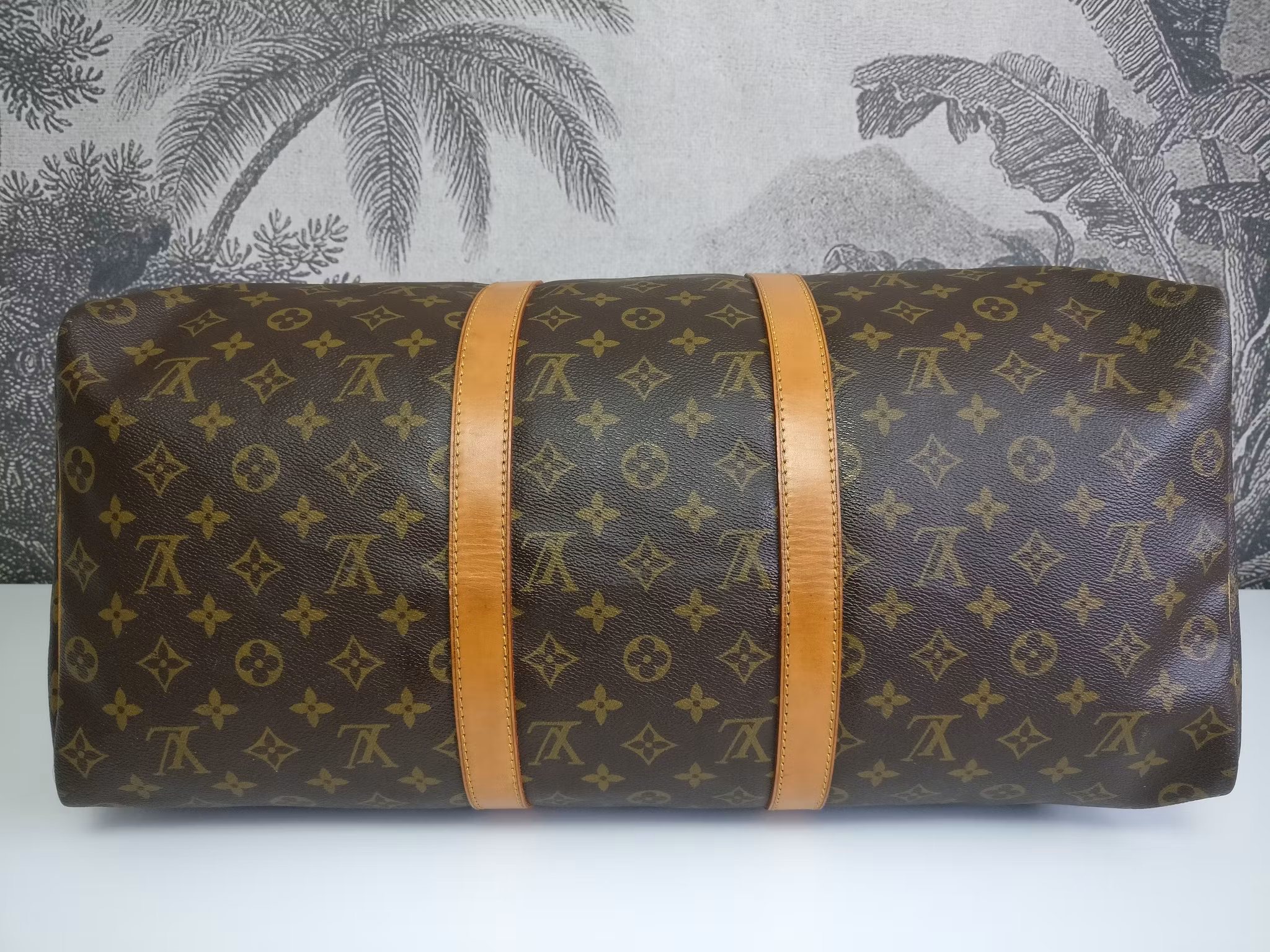 Keepall 50 weekend bag i gott vintageskick, med bruksspår. Monogram canvas i gott skick, mjuk och följsam med något enstaka märke. Nedre hörnen i gott skick med små bruksspår. Vachettalädret har en medium honungspatina och är överlag väl omhändertaget, med bruksspår såsom torrhet, vattenfläckar och märken. Handtagen är stadiga, märken och fläckar förekommer. Gold hardware är i gott skick med fin glans. Dragkedjan är stadig, den ena dragkedjan är generellt sett något trögare än den andra på Keepalls, så även i detta fall. Insidan är ren med något enstaka märke. Medium vintagedoft inuti väskan. Kommer med äkthetsintyg.