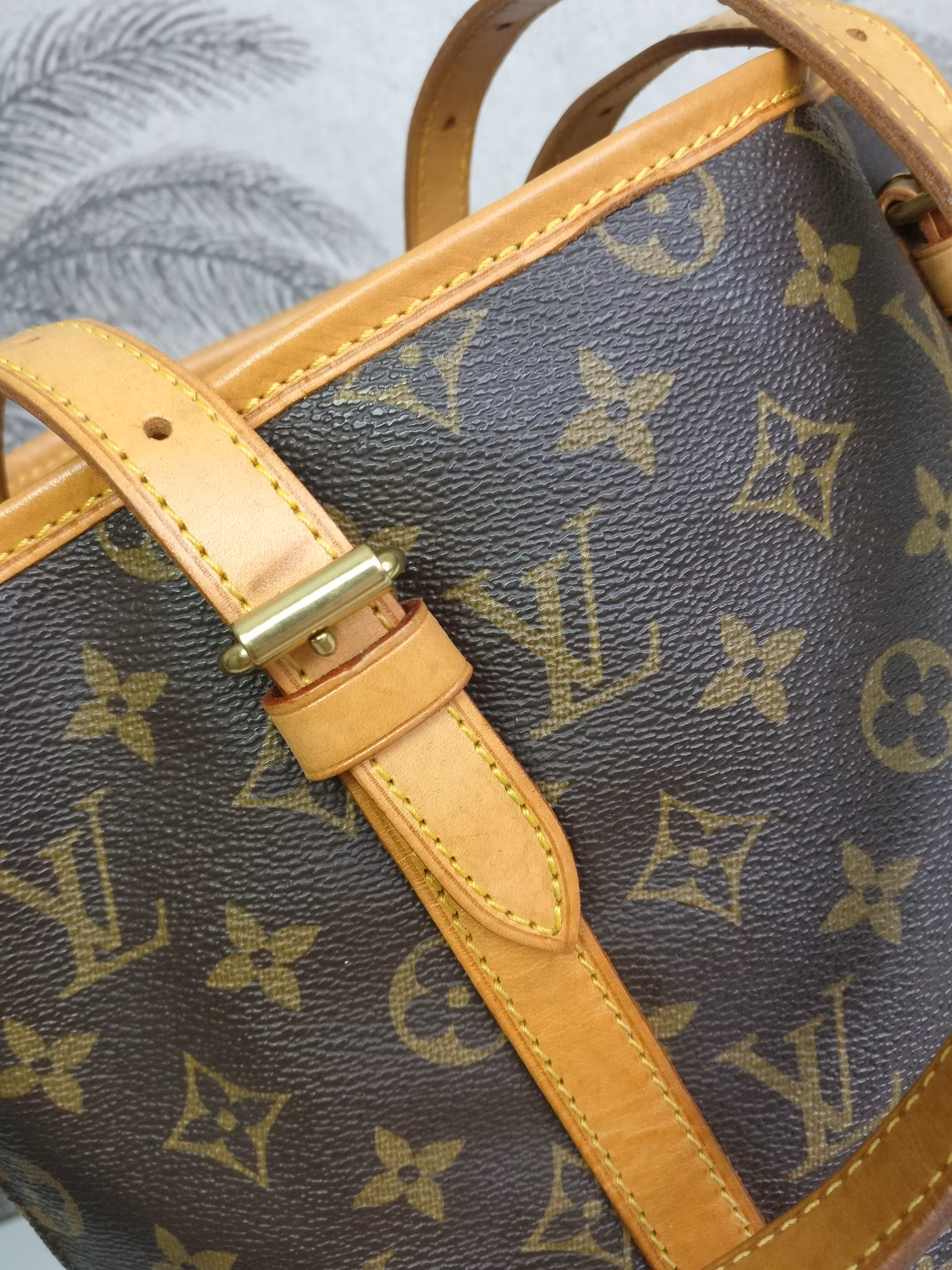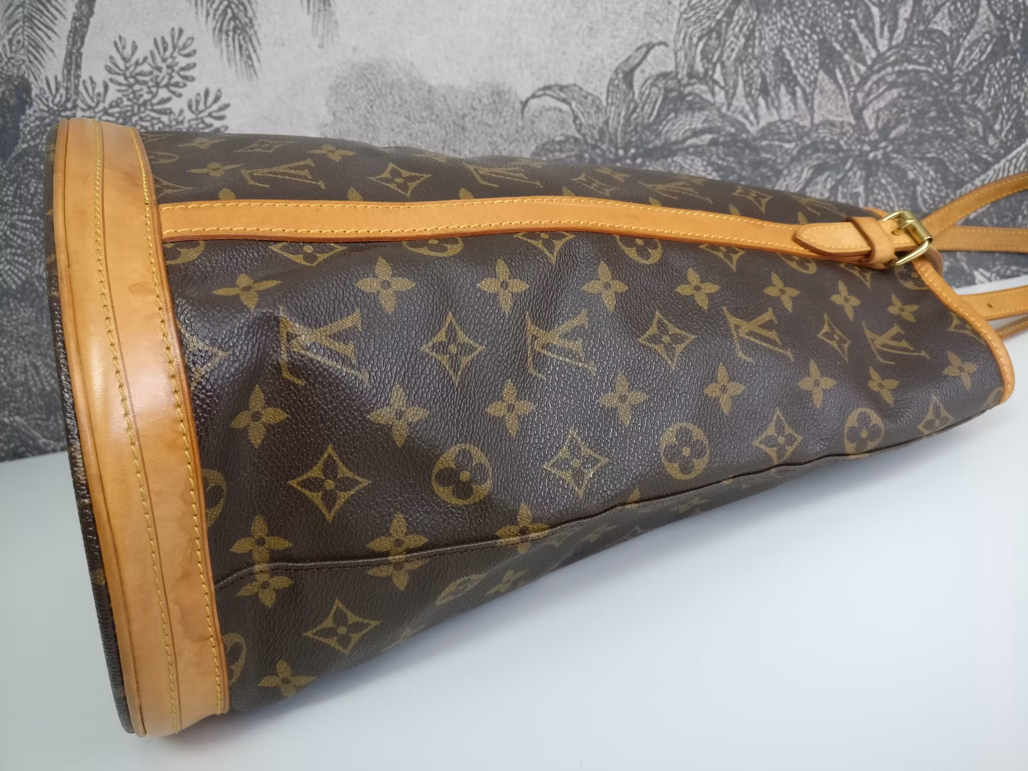 Bucket GM i gott vintageskick. Monogram canvas är i mycket fint skick. Väskan är renoverad invändigt hos Louis Vuitton år 2007 då väskan har fått nytt foder och i samband med det ny date code. Insidan i ljusbeige läder har ett huvudfack samt två extrafack, varav ett med dragkedja. Mycket fint skick och ren inuti. Mildare vintagedoft finns i väskan då den legat oanvänd en tid. D-ring med kedja där man kan fästa sin pochette, nyckelhållare etc. Lädret på utsidan av väskan har en medium honungspatina, i gott skick med fläckar och märken. Kommer med äkthetsintyg.