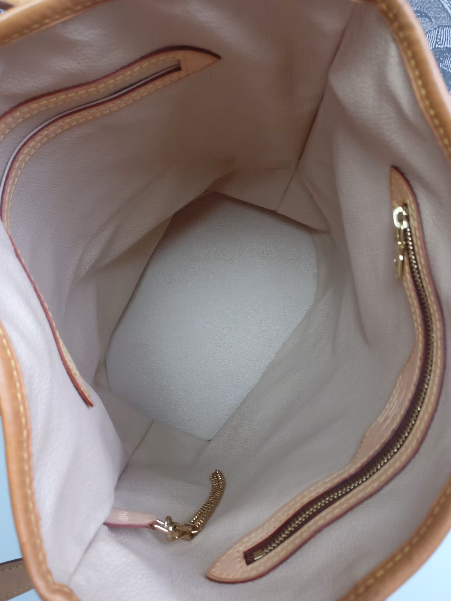 Bucket GM bag in good vintage condition. Monogram canvas in very good condition. The inside has been renovated year 2007 at Louis Vuitton with a completely new lining, in very good condition and clean inside. Inside has a main compartment and two extra compartments, one with zipper which works fine. There is a milder vintage odor inside. D-ring inside with a chain where you can attach your pochette, key holder etc. The outside leather and handles have a medium honey patina with some marks and spots. Comes with certificate of authenticity.