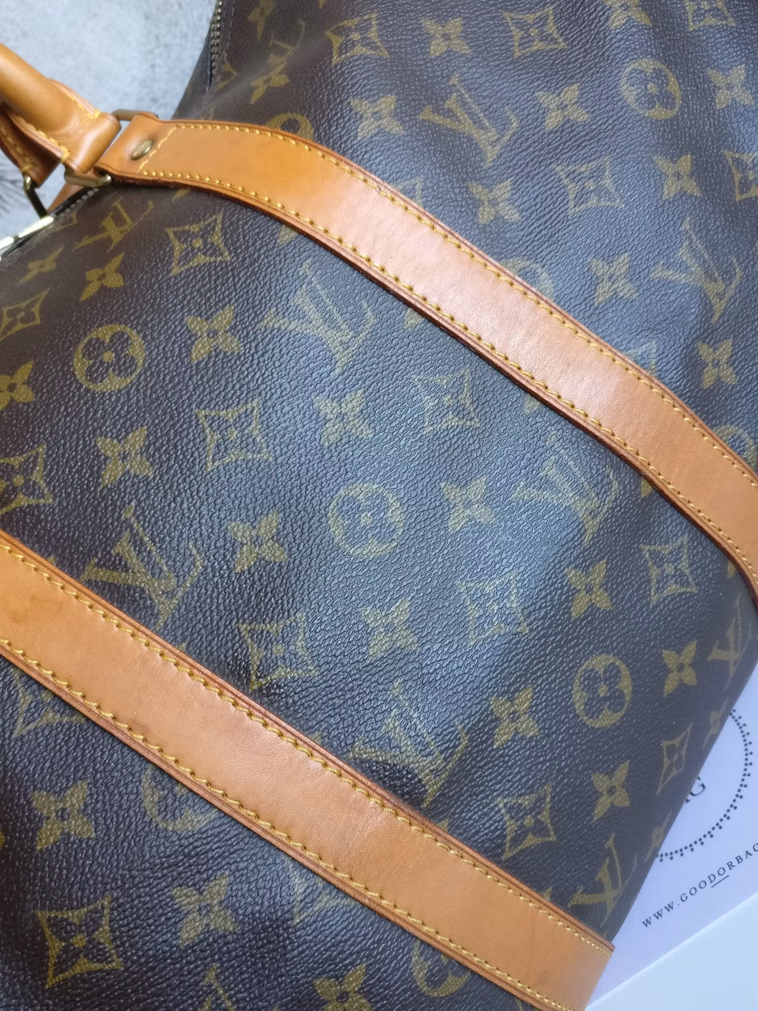 Keepall 50 weekend bag in good vintage condition. The bag is well kept for its age, with small signs of wear. Monogram canvas in good condition, soft and supple with a beautiful shine with an occasional minimal mark. Corners in good condition with minimal signs of wear. Clean inside, a mild vintage odor and a sweet/clean perfume scent is present inside. Vachetta leather is well taken care of and in good condition, with small signs of wear such as water spots, some marks underneath the bag. The handles have a beautiful shine, sturdy with no major dryness. Gold hardware generally in good condition. The zippers run smoothly. Comes with certificate of authenticity.