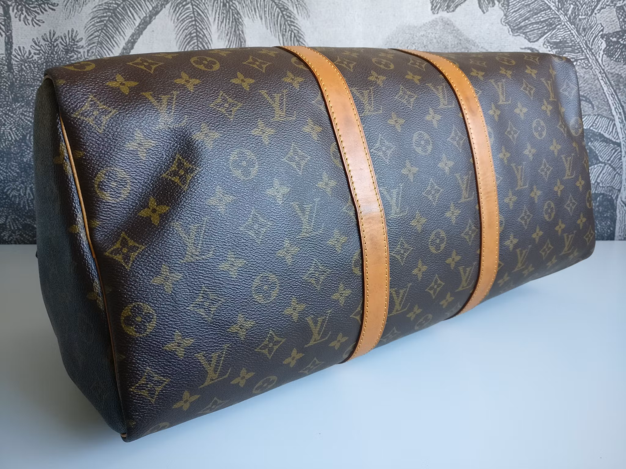 Keepall 50 weekend bag i fint vintageskick. Väskan är välbevarad för sin ålder, med små bruksspår. Monogram canvas i fint skick med vacker glans, canvasen är mjuk och följsam med något enstaka minimalt märke. Nedre hörnen i gott skick med minimala bruksspår. Ren inuti, en mildare vintagedoft samt doft av parfym (av typen söt/clean, ej offensiv). All vachetta är i fint skick och väl omhändertaget med vacker glans, fläckar undertill och några märken och vattenfläckar. Handtagen har vacker glans, är stadiga utan större torrhet. Hardware i generellt gott skick. Dragkedjorna är stadiga och löper på smidigt. Kommer med äkthetsintyg.