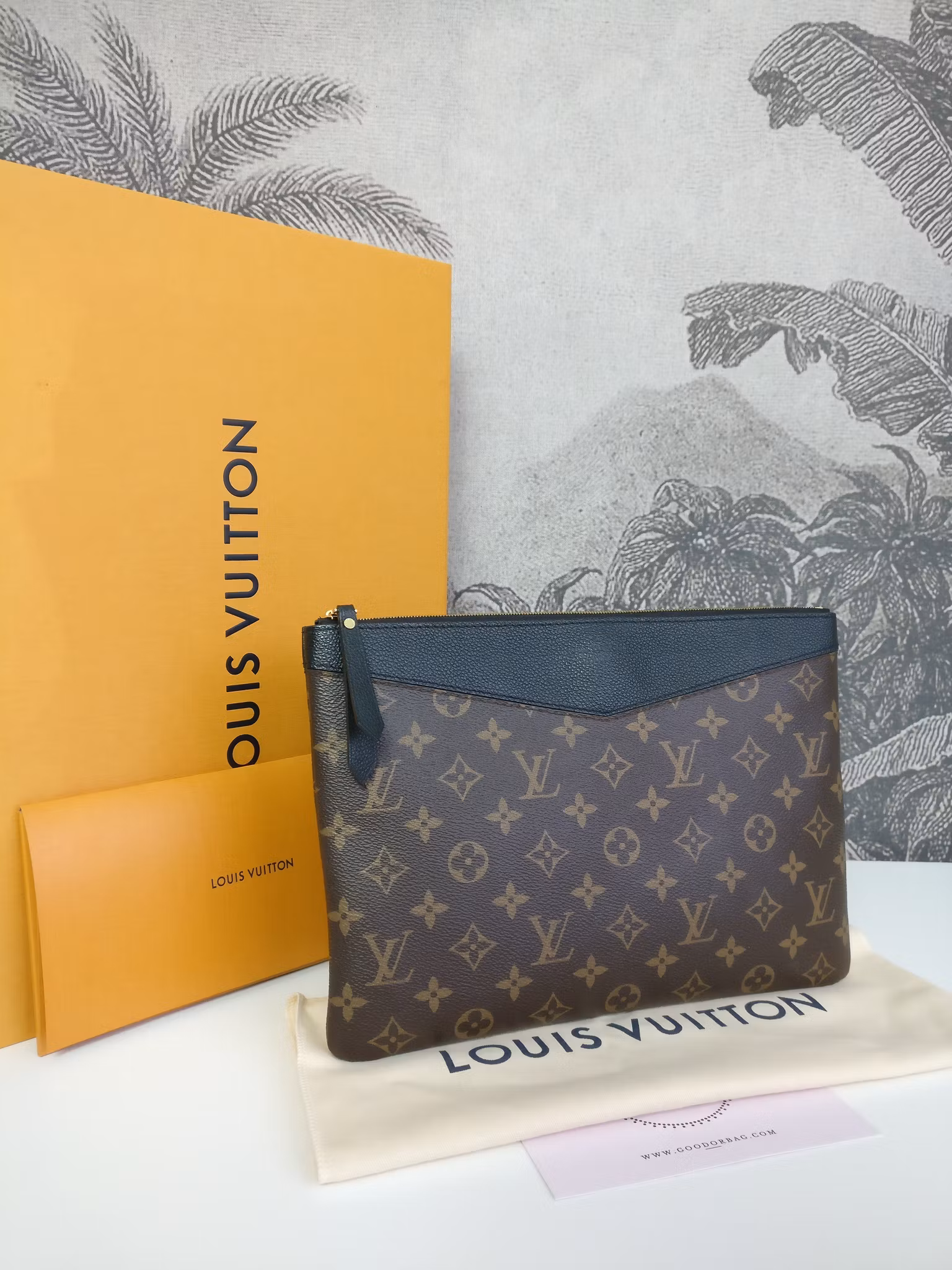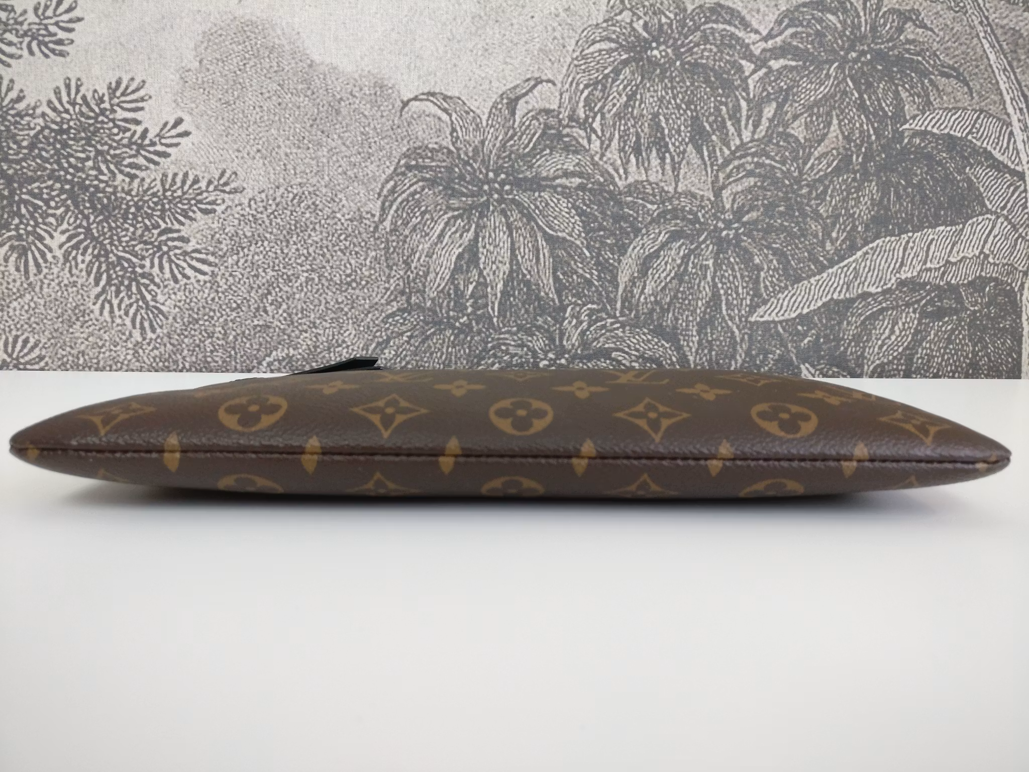 Louis Vuitton Daily Pouch in monogram canvas and black leather. The pouch is in good used condition. Monogram canvas in very good condition, leather parts in good condition with minor signs of wear. Gold hardware in good condition with minor color loss. Zipper works well. Inside is lined in with black alcantara. The inside is clean aside from a couple of minimal marks. No odor inside the bag. Comes with box (minor marks on box), dust bag, original receipt and certificate of authenticity.