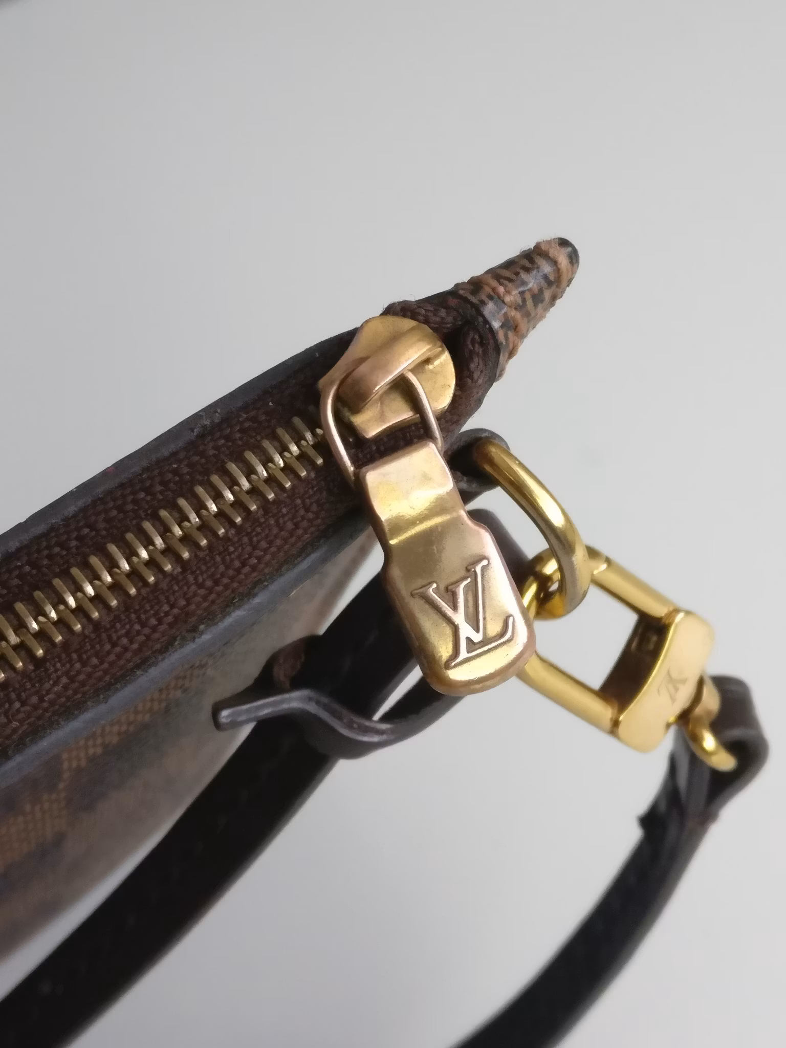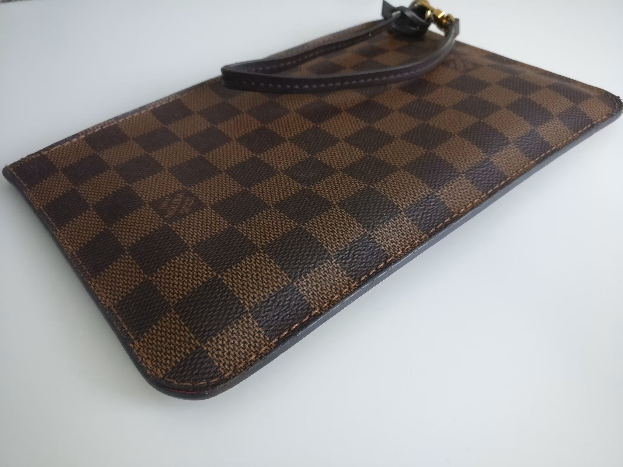 Pochette tillhörande Neverfull MM/GM i damier ebene i bruksskick. Damier ebene canvas i gott skick. Metalldelar med färgbortfall och bruksspår, dragkedjan fungerar fint. Spår av användning på glazingen runtom pochetten och hörnen. Bruna läderdetaljer är fullt funktionella med bruksspår. Insida fodrad i canvas i rött. Ren inuti med små bruksspår. Instängd doft. Bärs i handen, man kan även köpa till ett conversion kit och bära pochetten som en crossbodyväska. Kommer med äkthetsintyg.