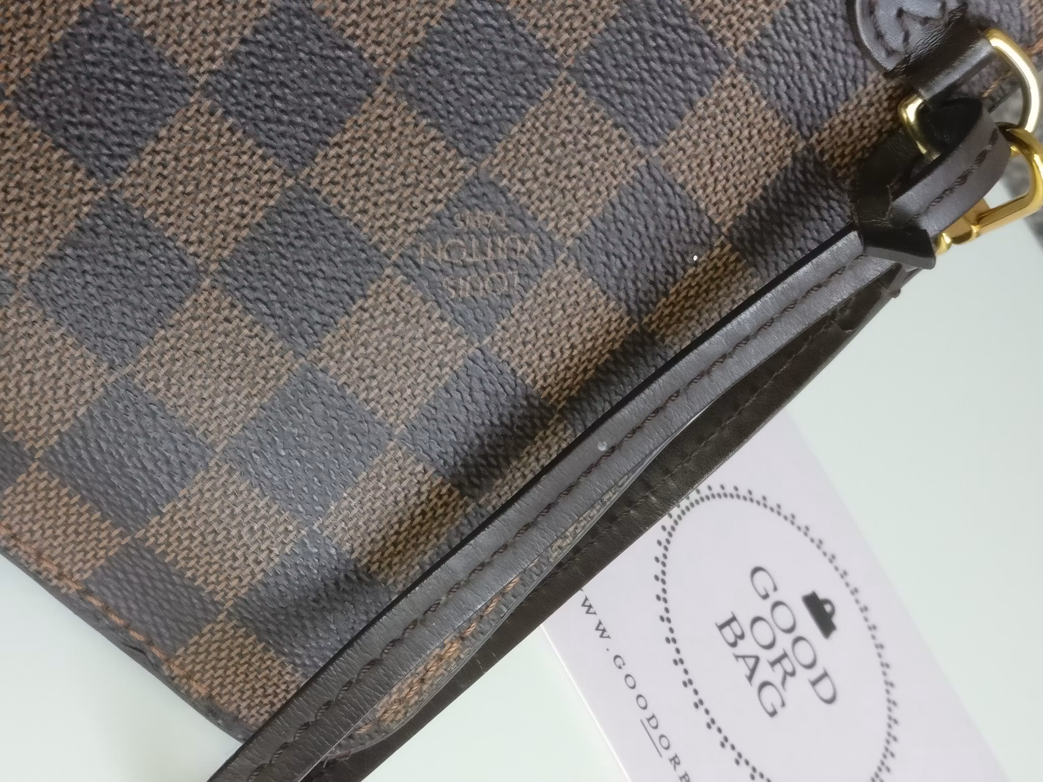 CONDITION/DESCRIPTION: Neverfull MM/GM pochette in used condition with signs of wear. Damier ebene canvas is in good condition. Gold hardware with some color loss, zipper works well. Some marks and signs of wear on the glazing and corners. Brown leather details are fully functional with signs of wear. Inside in cherry red. Clean inside with small signs of wear. Storage odor inside. Can be worn in the hand, or one can buy a conversion kit and make it into a crossbody bag/pochette. Comes with certificate of authenticity.