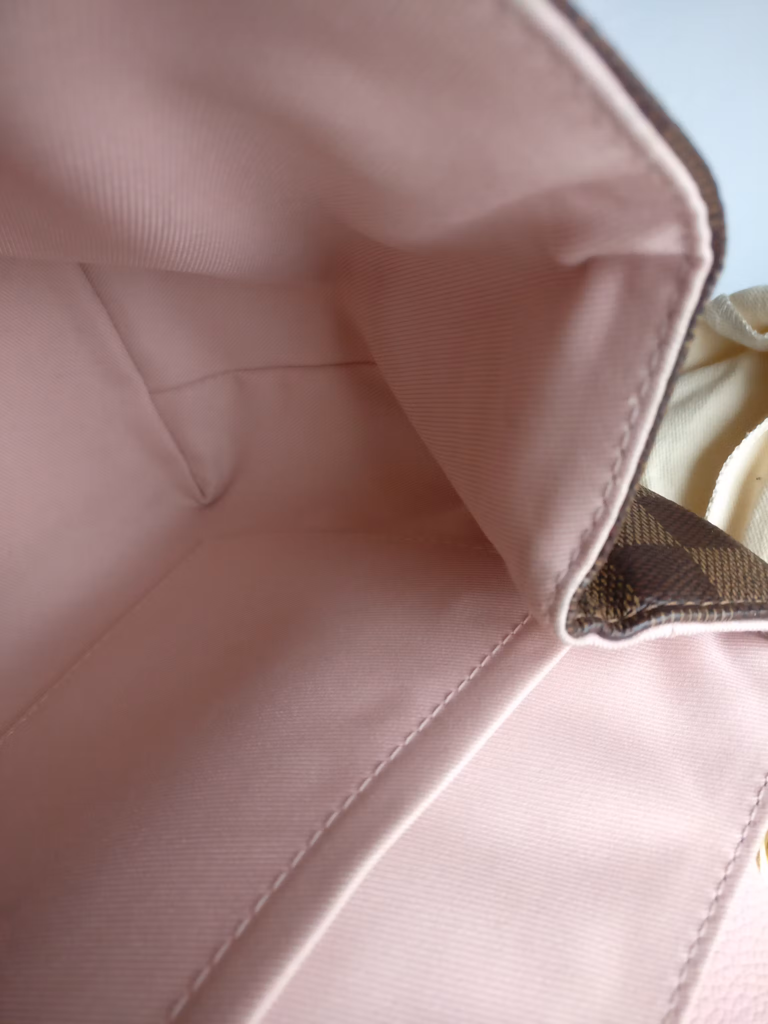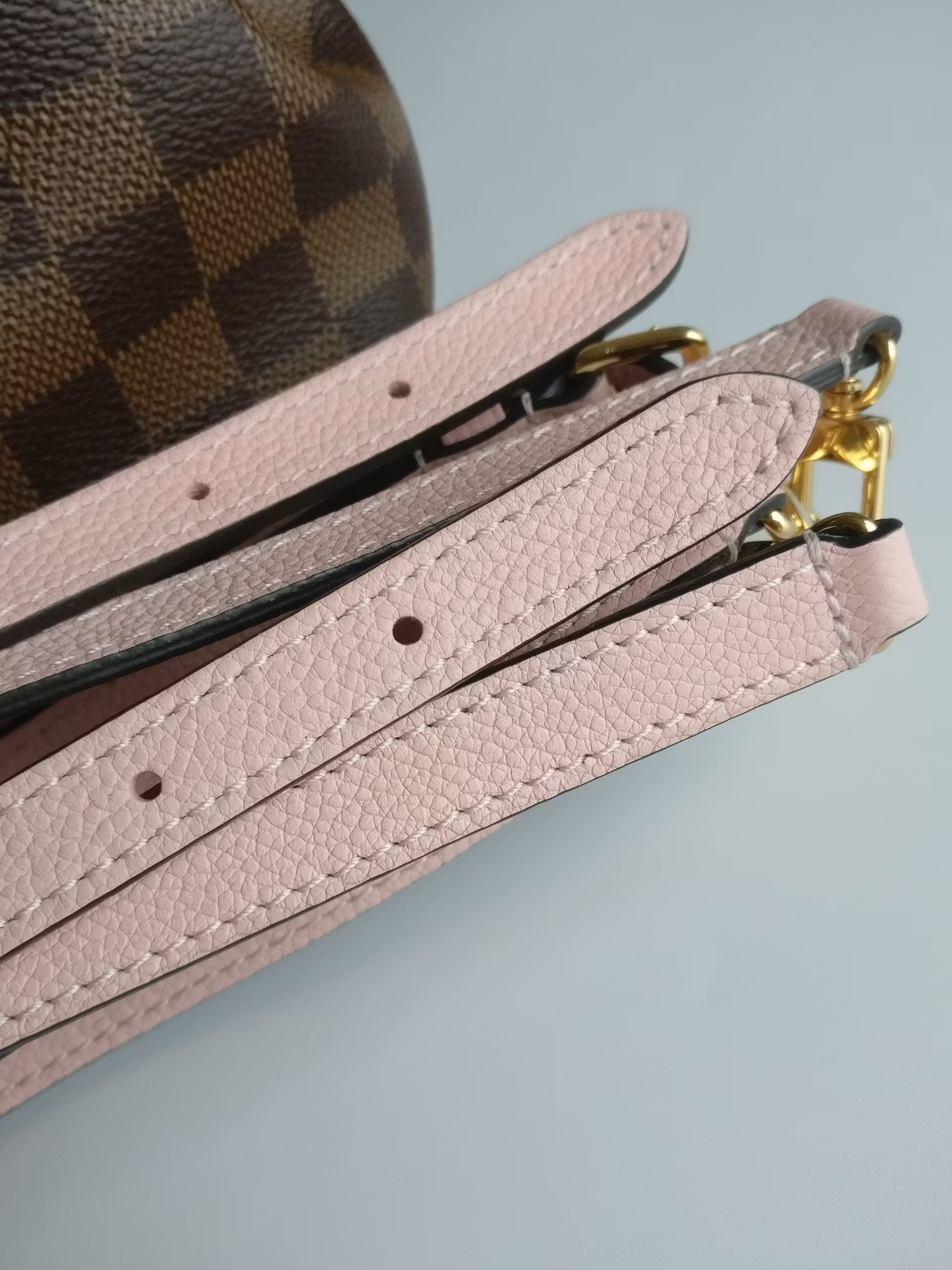 Louis Vuitton Clapton ryggsäck / axelbandsväska i gott skick, varsamt använd med minimala bruksspår. Damier ebene canvas i utmärkt skick, botten och nedre hörnen är fina med minimala bruksspår. Läderdetaljer och axelband i rosa, färg "Magnolia". Axelbanden är i utmärkt skick, de är både avtagbara och reglerbara. Väskan kan även bäras som en bucket bag i handen med handtaget upptill, med axelbanden som en ryggsäck, crossbodyväska eller axelväska. Mindre fading och repighet på gold hardware. Låset fungerar fint. Insidan är fodrad i rosa canvas, gott skick, ren inuti med mindre bruksspår. Ingen doft i väskan. Kommer med dust bag, originalkvitto och äkthetsintyg.