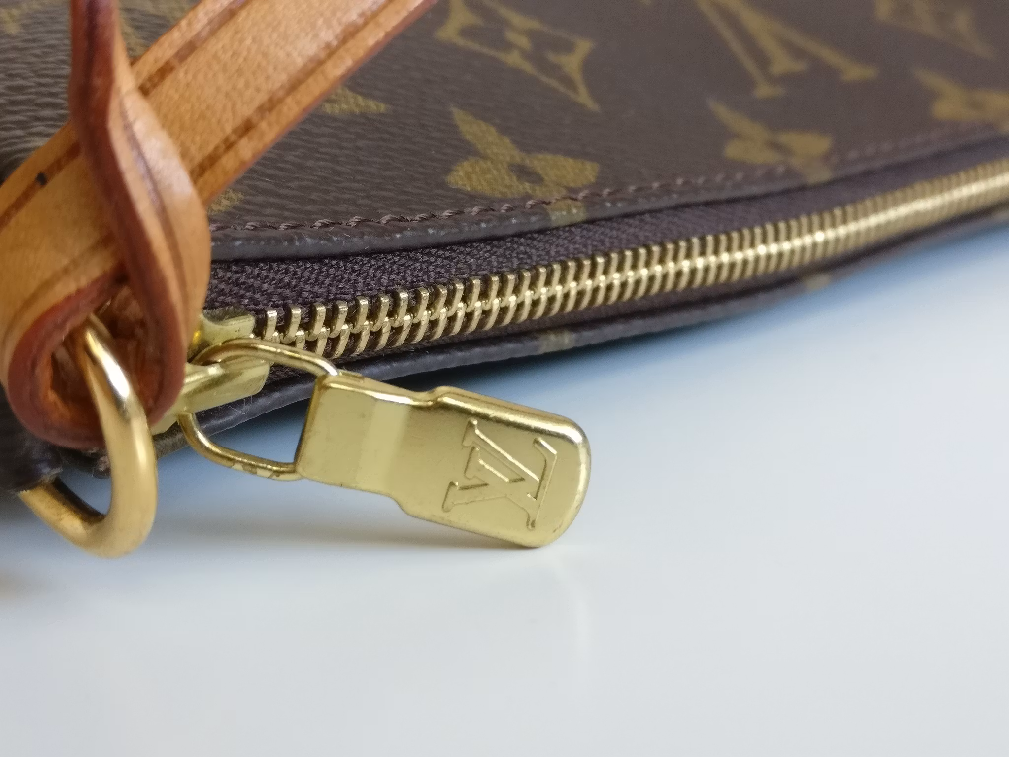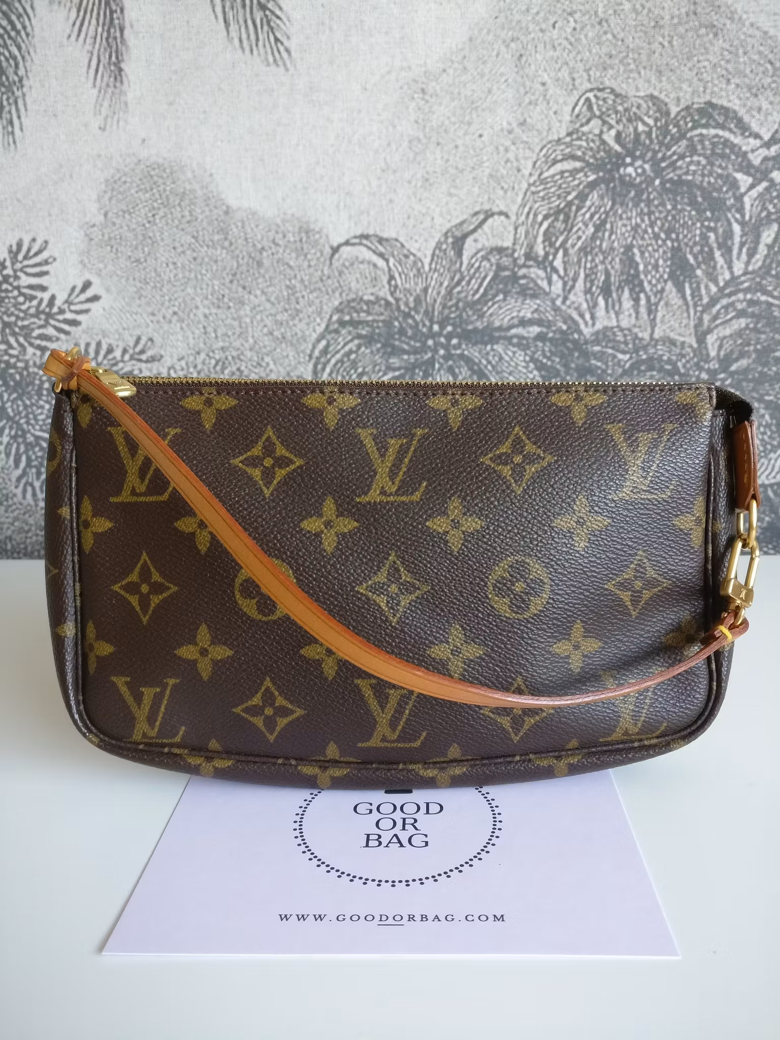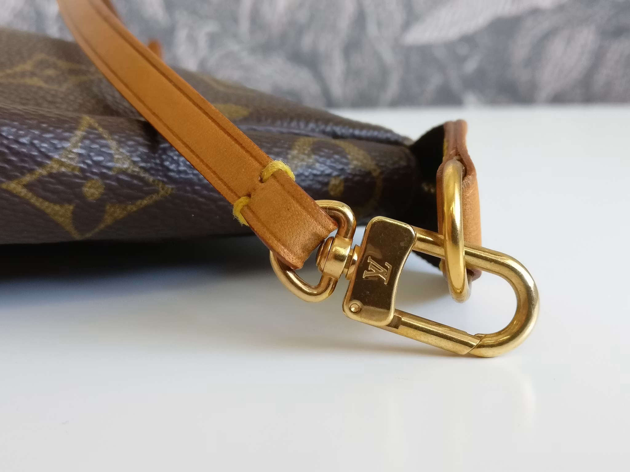 Pochette Accessoires i underbart vintageskick, mycket väl omhändertagen med minimala bruksspår. Monogram canvas är i mycket fint skick, hörnen och botten är fina. Gold hardware i gott skick med fin glans med minimala bruksspår. Vachettan har medium honungspatina. Remmen är stadig och i gott skick med små bruksspår. Dragkedjan fungerar fint. Ren inuti, ingen doft i väskan. En längre kedja eller rem kan fästas på för att bära väskan crossbody. Kommer med äkthetsintyg.