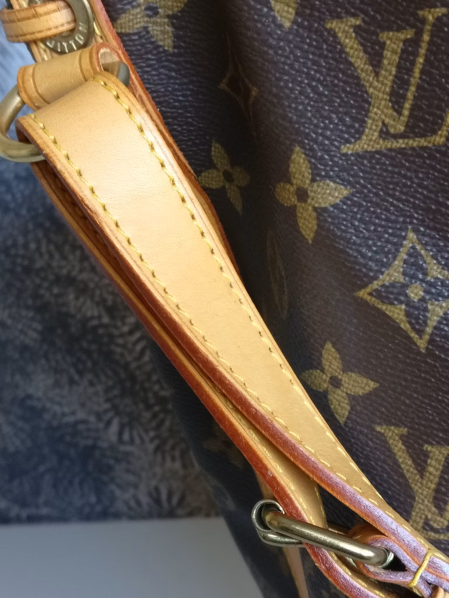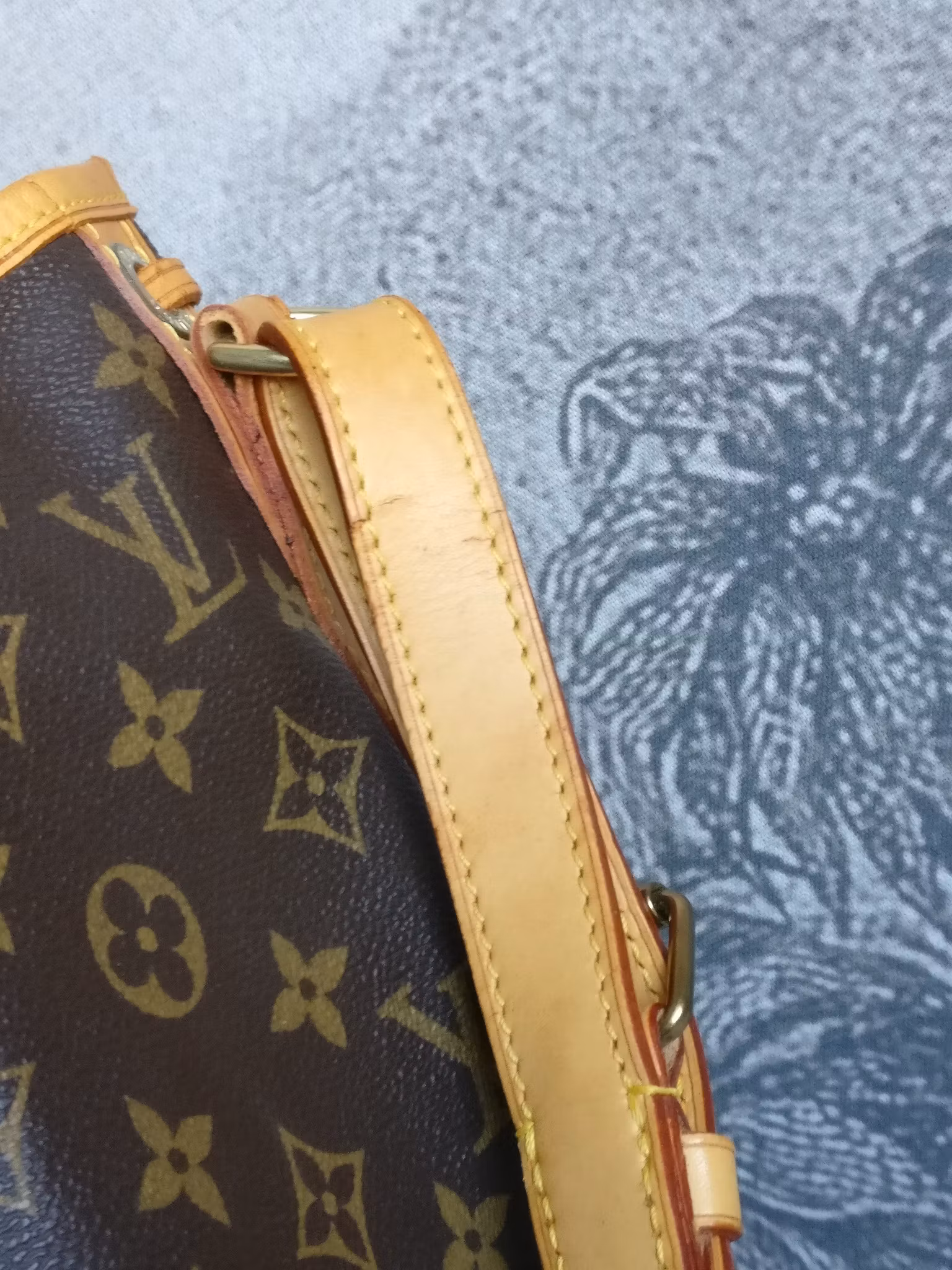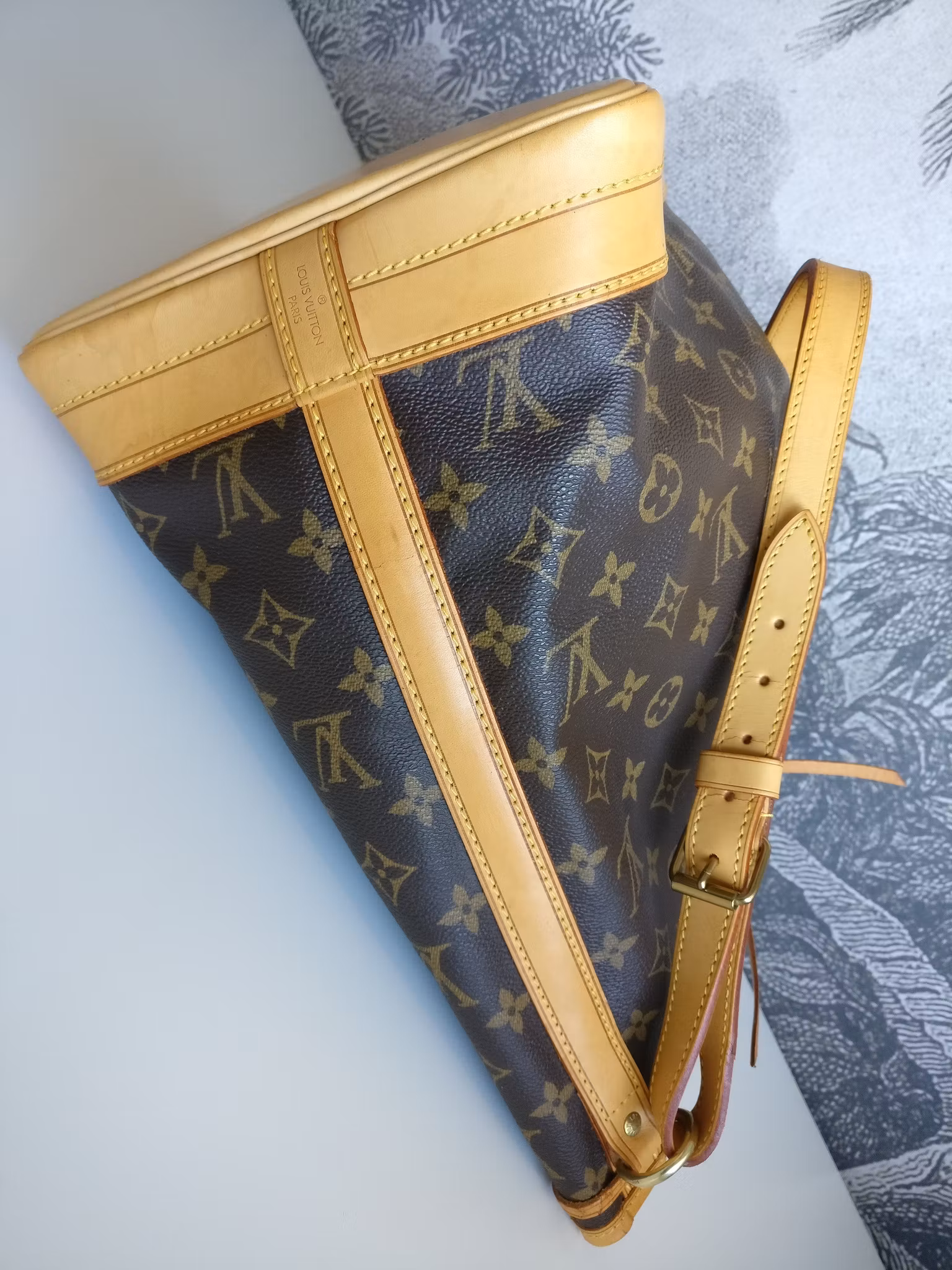 Noé GM generellt i gott vintageskick, med bruksspår på vissa delar av vachettan. Monogram canvas i fint skick. Vachettan har en ljus honungspatina. Bruksspår på vachettan: märken, vattenfläckar, torrhet på sidorevärerna. Axelbandet har torrhet. Botten och nedre hörnen i gott skick med mindre bruksspår. Övre kanten i läder har torrsprickor. Snöret som man stänger väskan med har torrsprickor. Möjligen behöver snöret bytas ut vid något tillfälle. Gold hardware i gott skick med fin glans, normala bruksspår. Insidan är ren, mild vintagedoft finns i väskan. D-ring på insidan där man kan fästa sin pochette, key holder etc. Nypris idag hos Louis Vuitton är 21.100:- SEK. Kommer med äkthetsintyg.