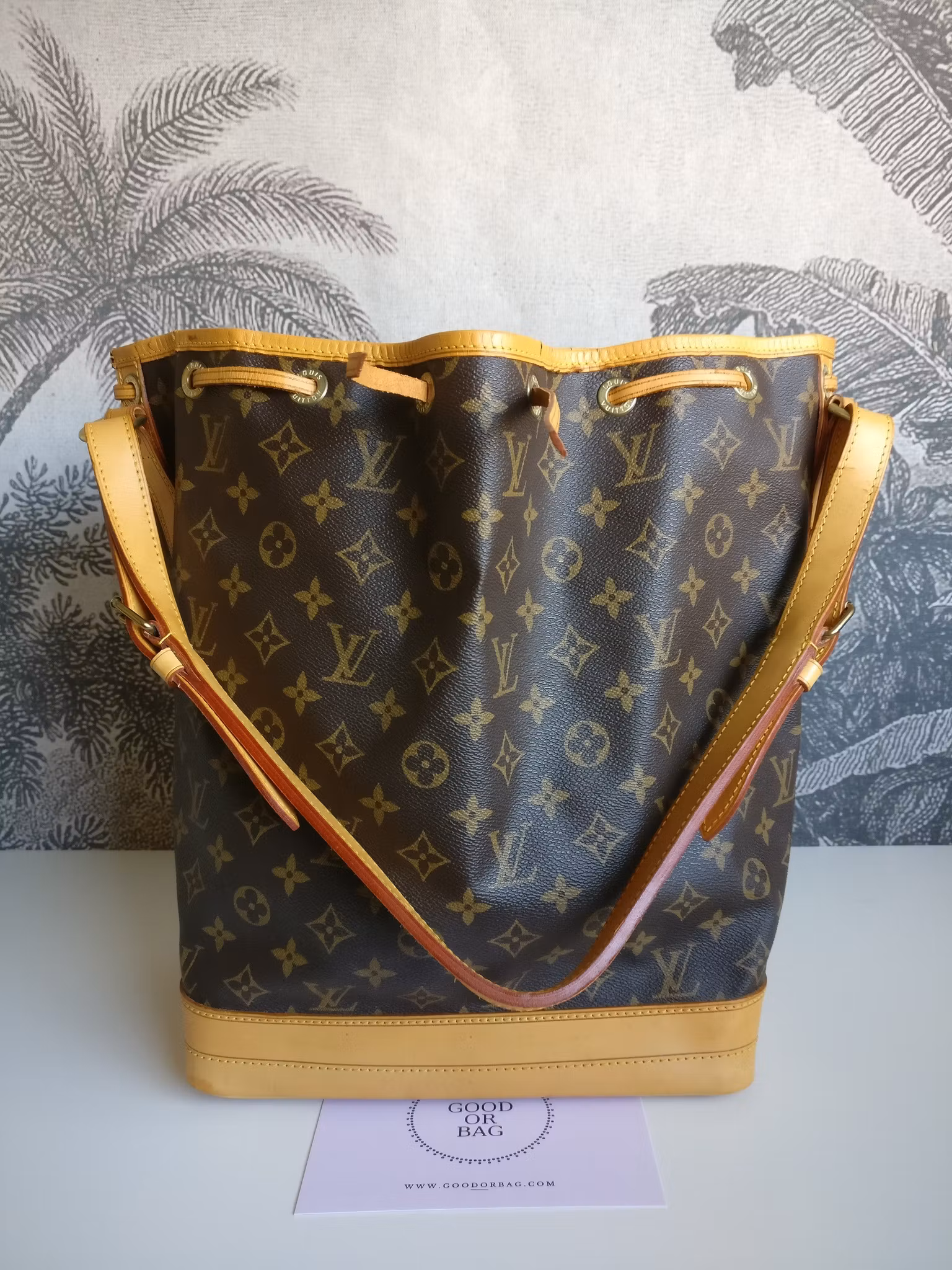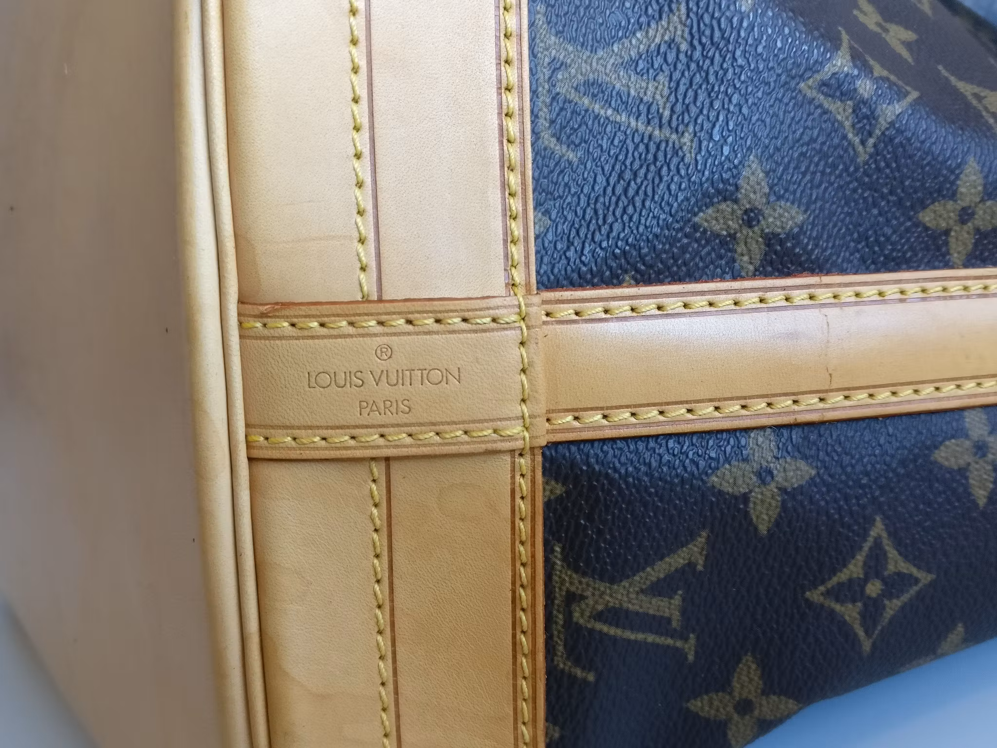 CONDITION/DESCRIPTION: Noé GM in generally good vintage condition, with signs of wear on some parts of the bag. Monogram canvas is in very good condition. Vachetta has a light honey patina. Signs of wear on the vachetta: marks, water spots, scratches, dryness on the sides. The shoulder strap has some dryness. Corners and bottom in beautiful condition. The upper leather rim has dry cracks. Drawstring has dry cracks. The leather drawstring used to open and close the bag may have to be changed at some point, can be bought either at the Louis Vuitton store or one could use a regular leather drawstring. Gold hardware in good condition. Inside is clean, with a mild vintage odor inside the bag. D-ring inside to attach your pochette, key holder etc. Price new at Louis Vuitton is 21.100:- SEK. Comes with certificate of authenticity.