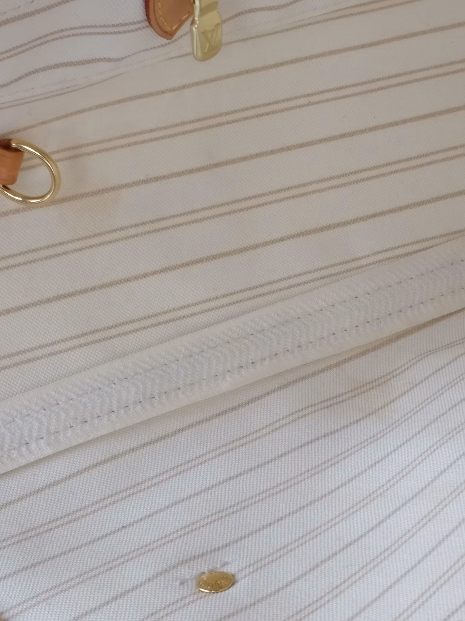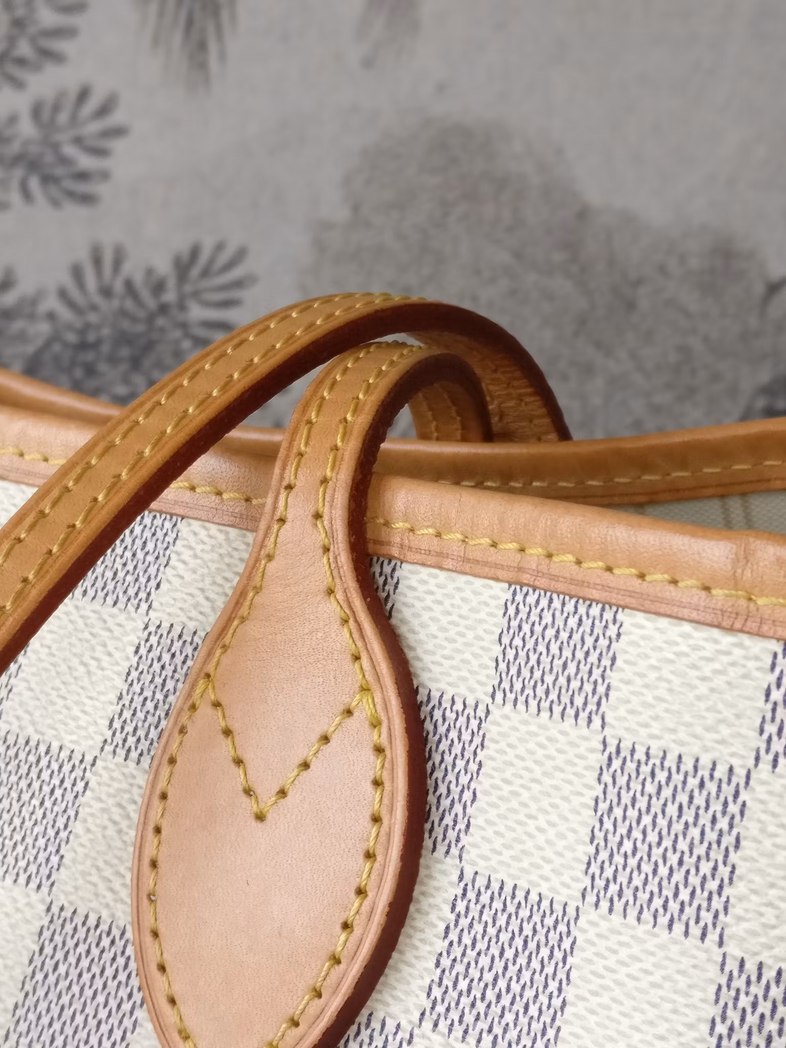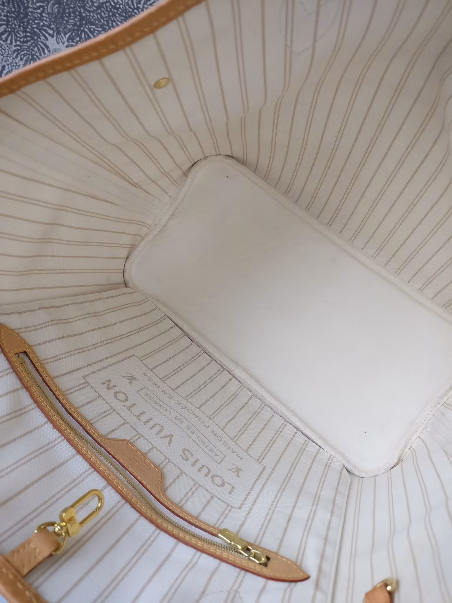 CONDITION/DESCRIPTION: Neverfull MM damier azur, bought new in June year 2022 in very good condition, with signs of wear. Damier azur canvas in very good condition, minimal wear on corners. Vachetta parts have a medium honey patina. Vachetta has some wear from normal use on handles, upper rim has a couple of marks and spots. Inside is lined with light beige canvas, generally clean inside with some spots and stains. No odor inside the bag. Hardware is in good condition, shiny with minimal signs of wear. Comes with box, dust bag, original order confirmation LV online, certificate of authenticity. No clutch.