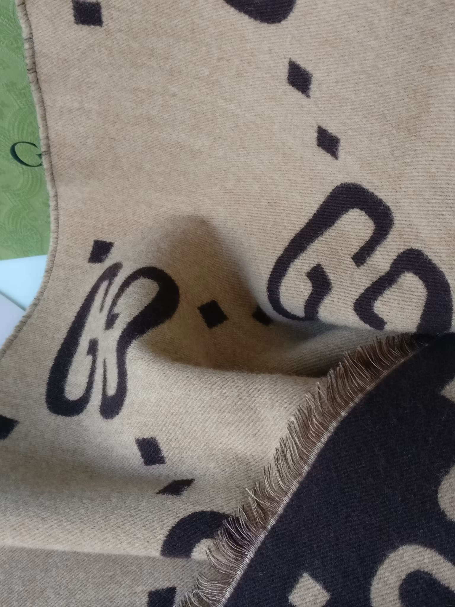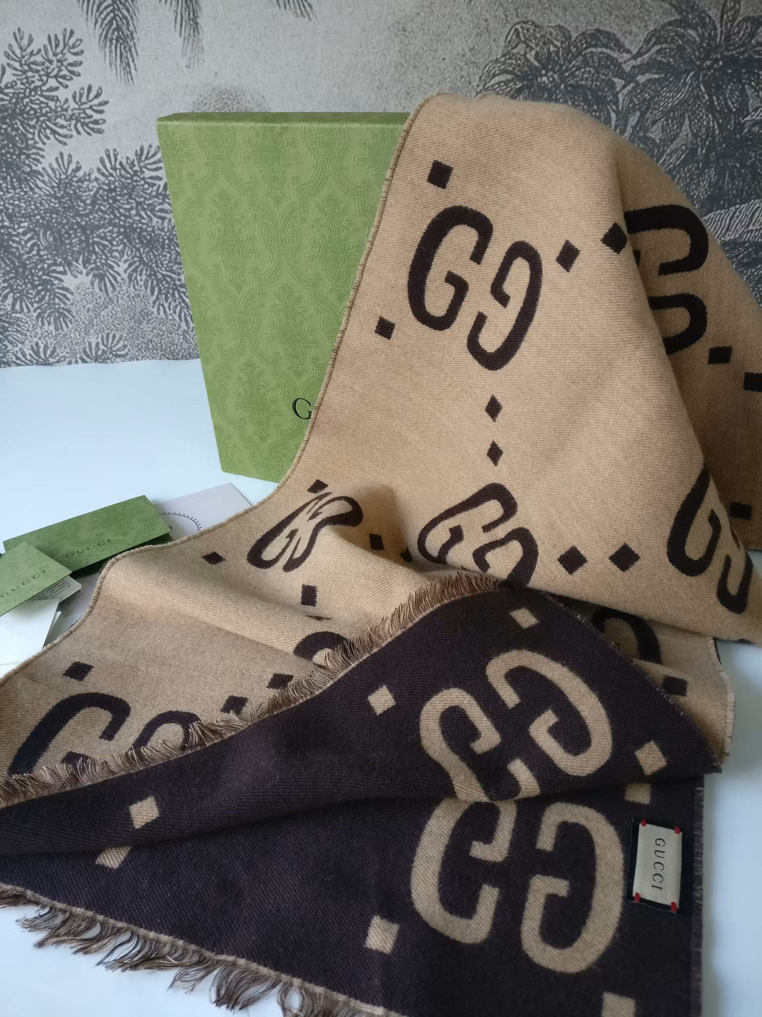 Gucci GG Jacquard Wool Silk scarf i brun och beige, en varm halsduk som passar perfekt inför höst och vinter. Halsduken är i gott skick, använd ett fåtal gånger efter inköp, mestadels legat i sin box i förvaring. Ren, minimala bruksspår. 91% ull, 9% siden med oversize GG-print i kontrasterande färg på båda sidor, fransar i kortändarna. Kommer med box, silkespapper, tags. originalkvitto från Gucci Stockholm, äkthetsintyg.