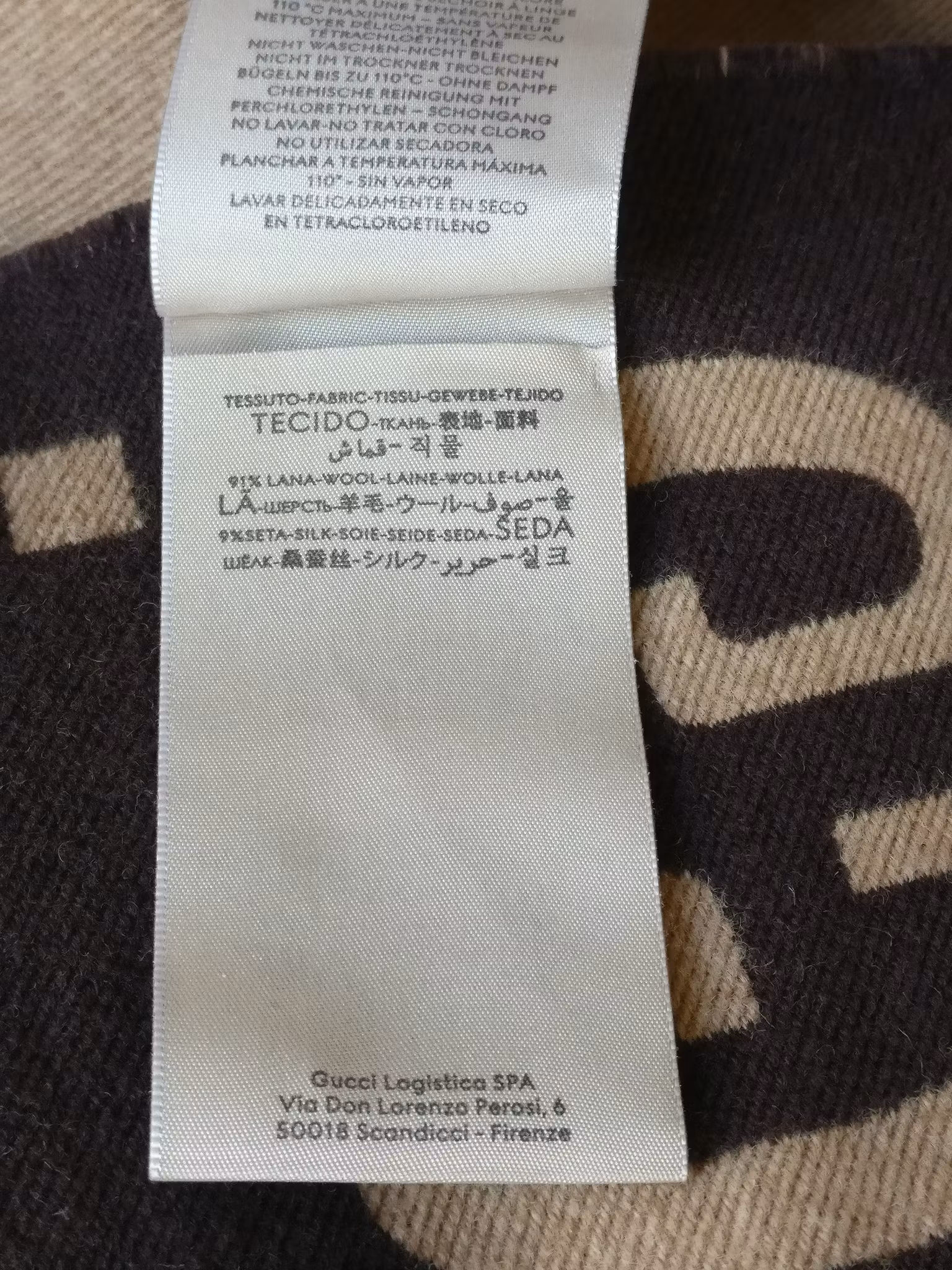 Gucci GG Jacquard Wool Silk scarf in brown and beige, a warm companion for winter. The shawl is in very good condition, used a few times with care since purchase, but mostly kept in storage in its box. Clean with minimal signs of wear. 91% wool, 9% silk, with oversize GG print in contrasting colors on both sides. Fringed edges. Comes with box, silk paper, tags, original receipt from Gucci Stockholm, certificate of authenticity.