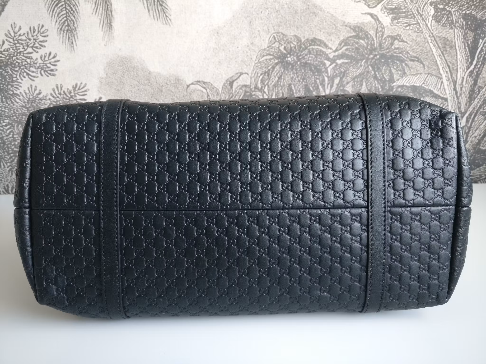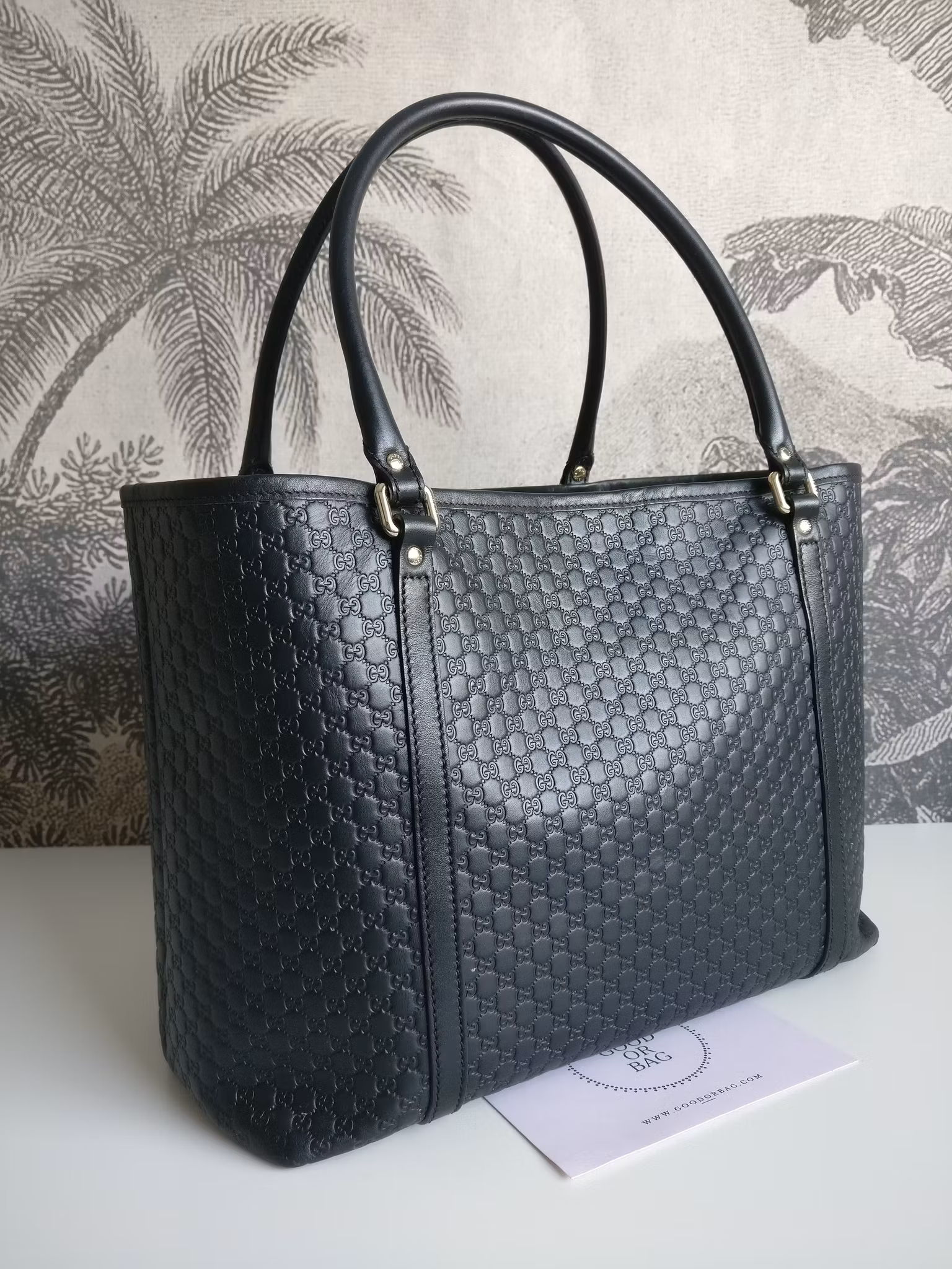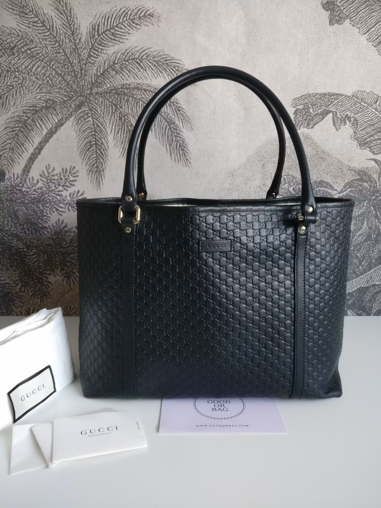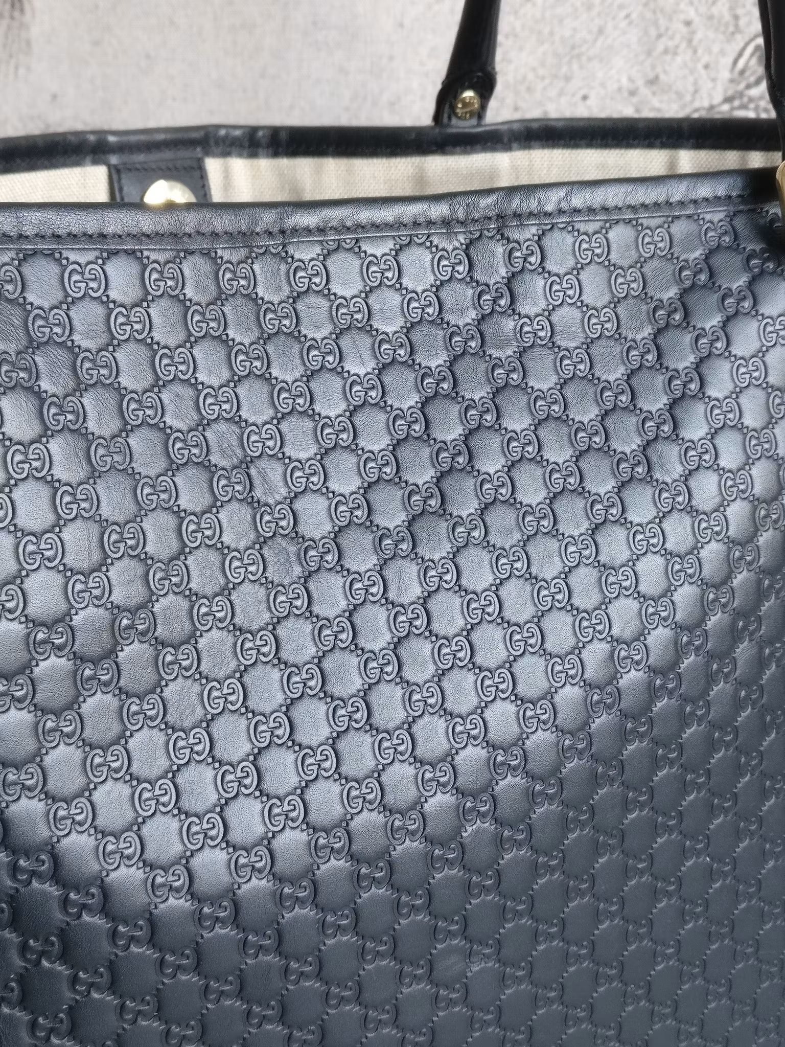 Gucci Microguccissima Leather tote in very good condition, with minimal signs of wear. Black embossed leather with the classic mini GG monogram. The leather is in very good condition, with some occasional scratch on the handle and minimal wear on lower corners. The bag closes with a button which works fine. Inside is lined with beige linen. Main compartment and an extra pocket with zipper and two slip pockets for phone etc. Clean inside. No odor of any kind in the bag. Gucci Outlet Store Special design purchase, as denoted by the “Ⓖ” imprint. Comes with dust bag and certificate of authenticity.
