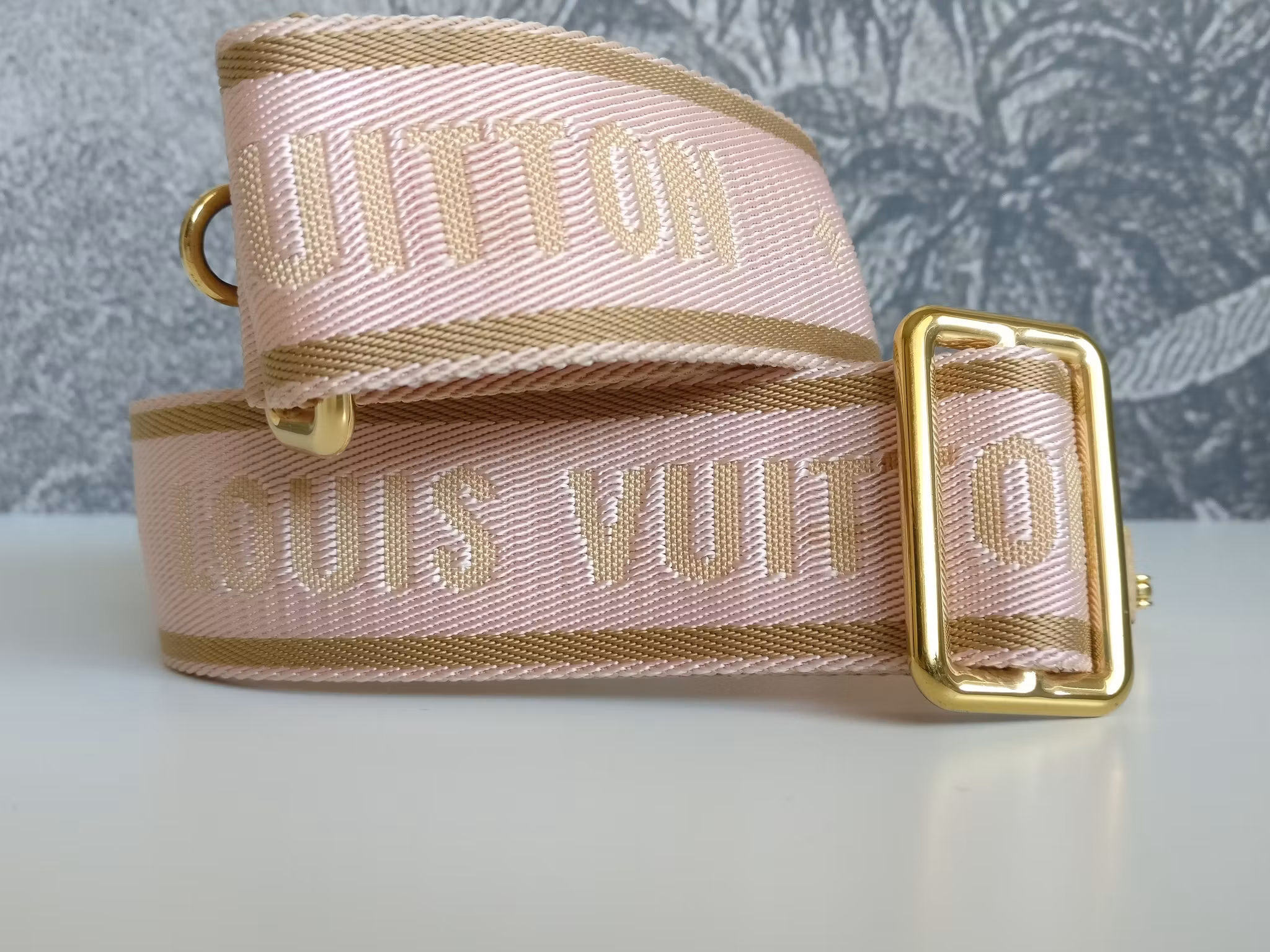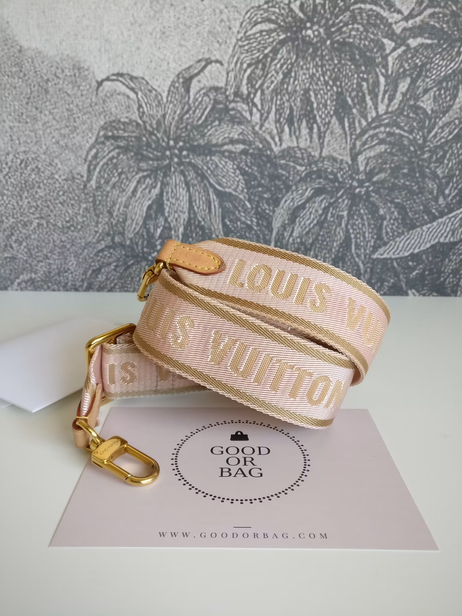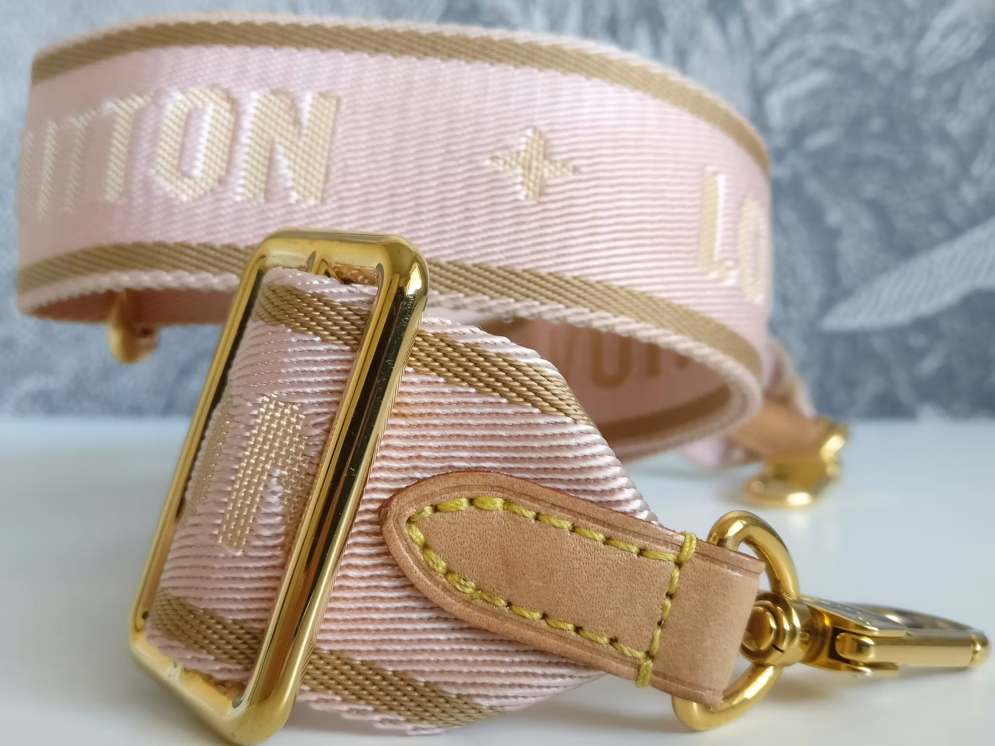 Louis Vuitton Bandouliere shoulder strap i puderrosa nylonjacquard i gott använt skick. Remmen är justerbar. Nylon canvas i gott skick, med mörkare partier på några ställen. Vachettaläder med medium honungspatina med bruksspår. Kan användas till valfri väska, kan bäras på axeln eller crossbody. Kommer med äkthetsintyg. Ingen round coin purse.