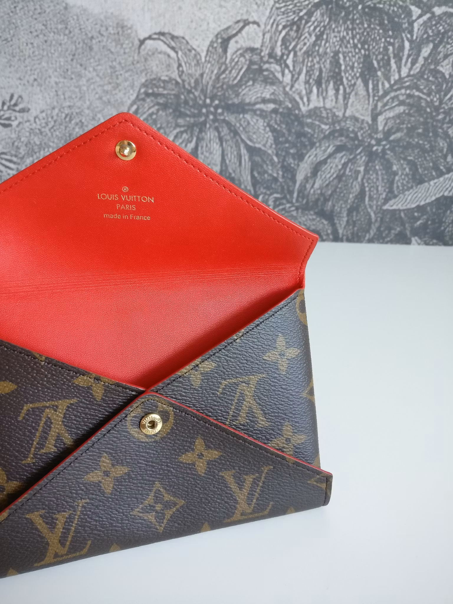 Mellanstorleken av pochetterna i Kirigami-familjen från år 2022. Pouchen är i gott använt skick, varsamt använd. Stängs med knapp i gott skick, med mindre repighet och färgbortfall på knappen. Perfekt förvaring för nycklar, pass, korthållare, sedlar etc. Minimala bruksspår på hörnen. Insidan är fodrad i rött läder. Ren inuti sånär som på något enstaka minimalt märke i fodret, ingen doft i pochetten. Originalkvitto har lämnats in för påseende i butiken men medföljer ej köpet eftersom ägaren behåller de andra storlekarna i setet. Kommer med äkthetsintyg. Microchip finns i den största pouchen i trion.