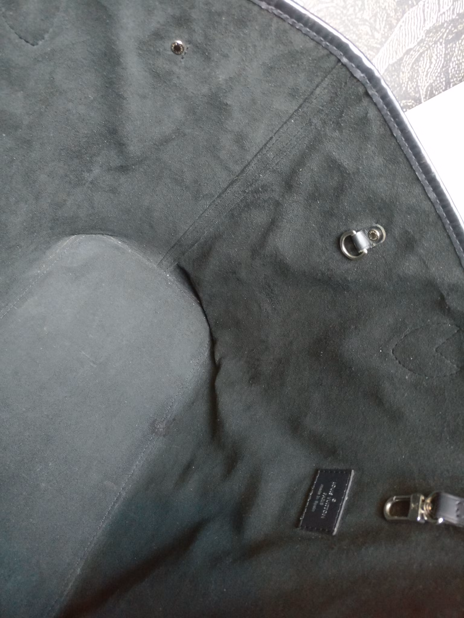 Neverfull MM i svart epiläder i bruksskick, med en hel del större bruksspår. Väskan har behållit sin form fint. Epilädret har bruksspår såsom märken, fläckar och skrapmärken. Nedre hörnen har bruksspår. Silver hardware med bruksspår. Färgskav och kantskav finns på handtagen som annars är stadiga. Insida i microfiber, bruksspår och märken i fodret, ingen doft i väskan.Kommer med box (bruksspår på boxen), kopia på originalkvitto och äkthetsintyg. Ingen clutch. Nypris idag hos Louis Vuitton är 24.100:- SEK.