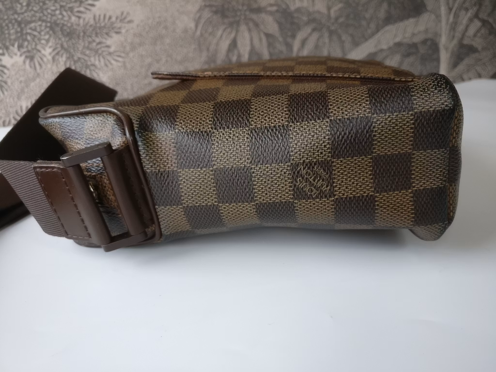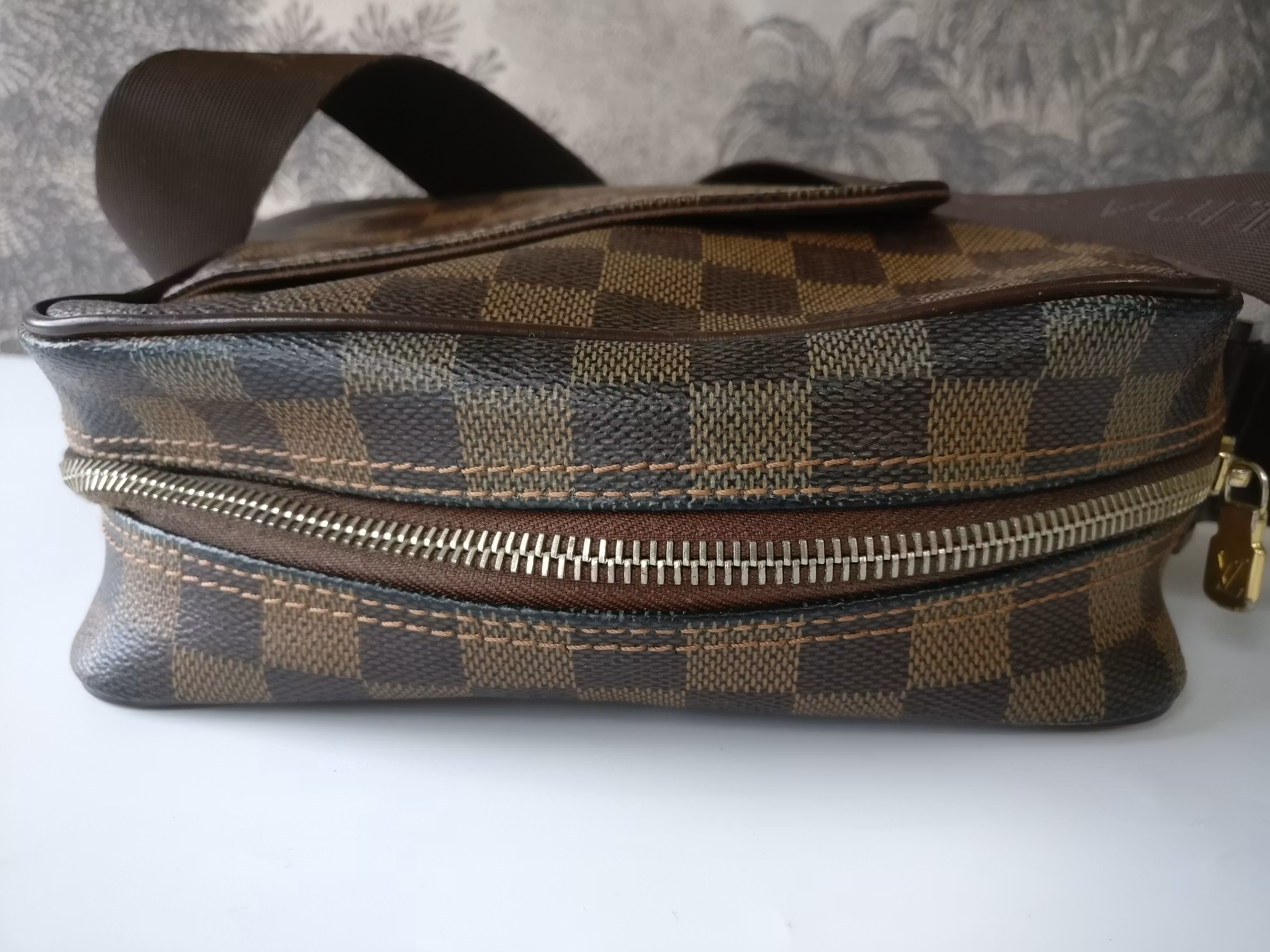 Olav PM sling bag/messenger bag in acceptable to good vintage condition, with signs of wear. Damier ebene canvas in good condition, some darker parts can be seen on the canvas. Leather trim in good conditon with some marks and scuffs. The adjustable shoulder strap is sturdy and in good condition with minimal signs of wear. A main pocket and an extra pocket inside. Lined in brown canvas. Clean inside with minimal signs of wear in the lining. No vintage odor. Gold hardware has some fading. The zipper has small signs of wear, runs smoothly. Comes with certificate of authenticity.