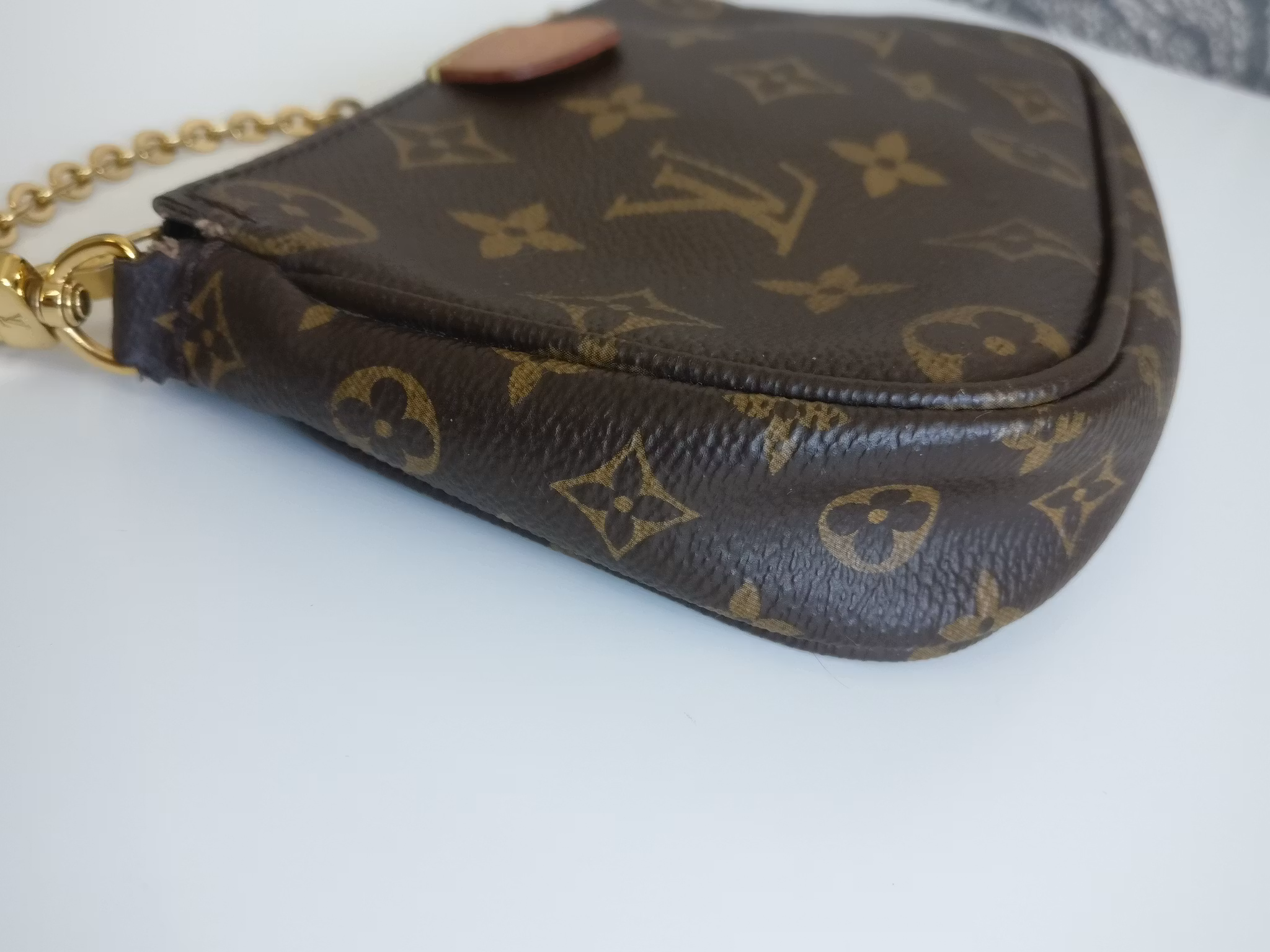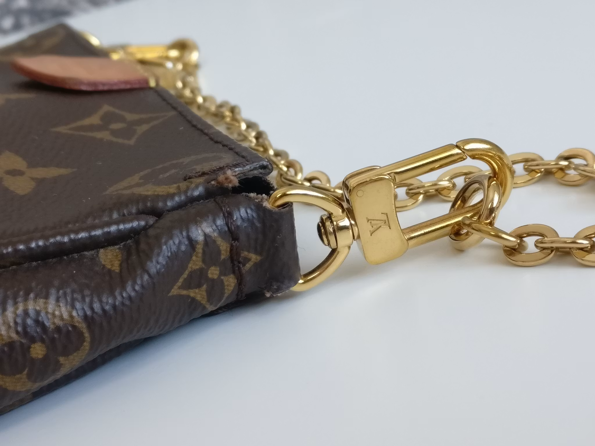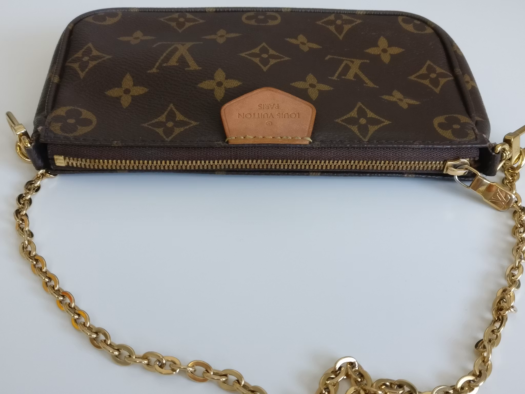 CONDITION/DESCRIPTION: Small Pochette from Multi Pochette Accessoires from 2020 in used condition. This is the smaller pouch from the Multi Pochette Accessoires which fits a smartphone and daily essentials. Price new for the whole set of bags today is 26.600:- SEK. Larger than the Mini Pochette Accessoires and smaller than the regular sized Pochette Accessoires which makes it a perfect middle size for those who seek for a size between the mini and regular. Monogram canvas in good condition, with some marks and upper corner wear. Vachetta tab has a medium honey patina. Detachable chain in gold toned hardware in good condition. Zipper works well. Inside has a couple of marks in the lining. Comes with certificate of authenticity and receipt from second hand store.