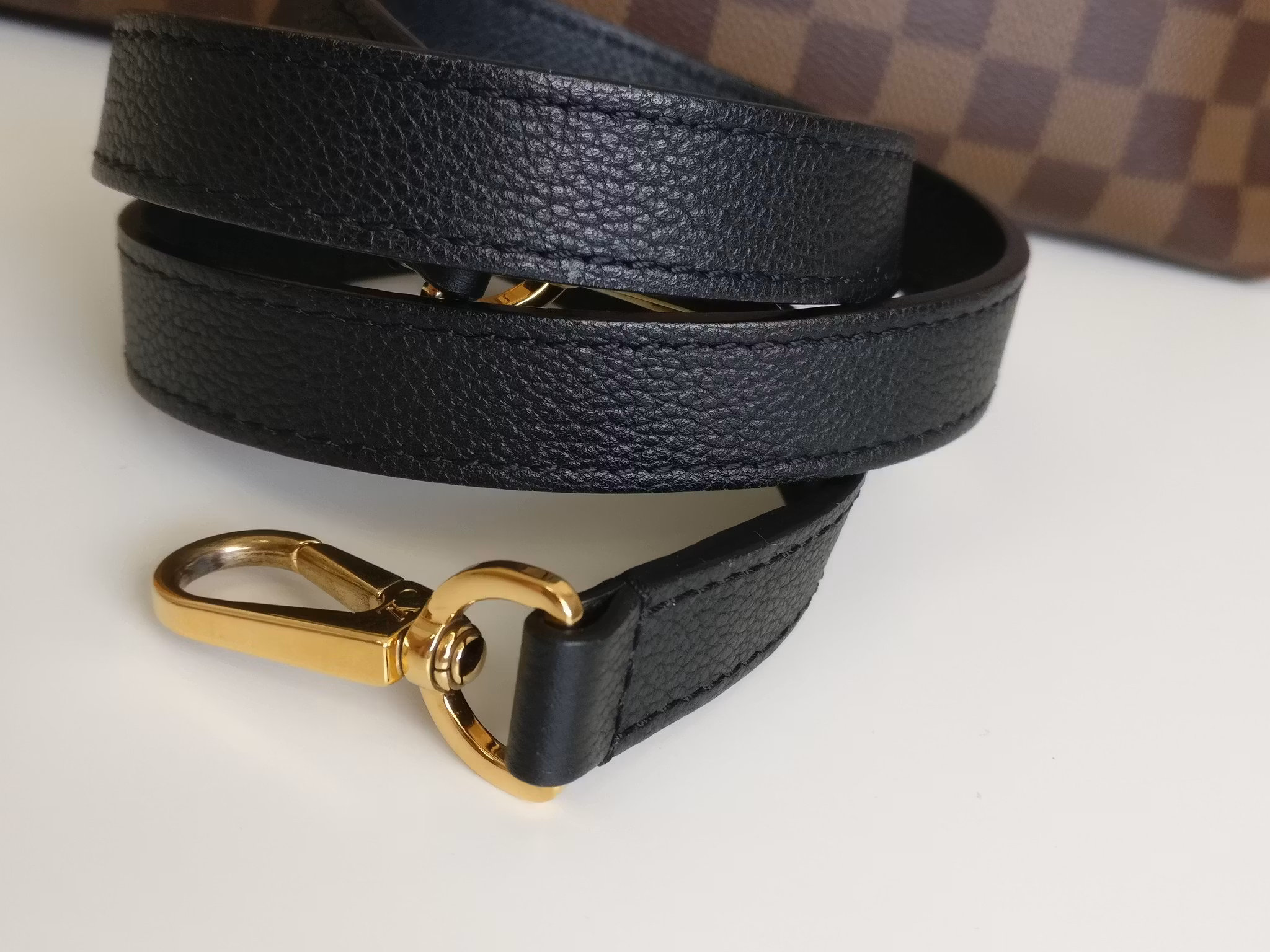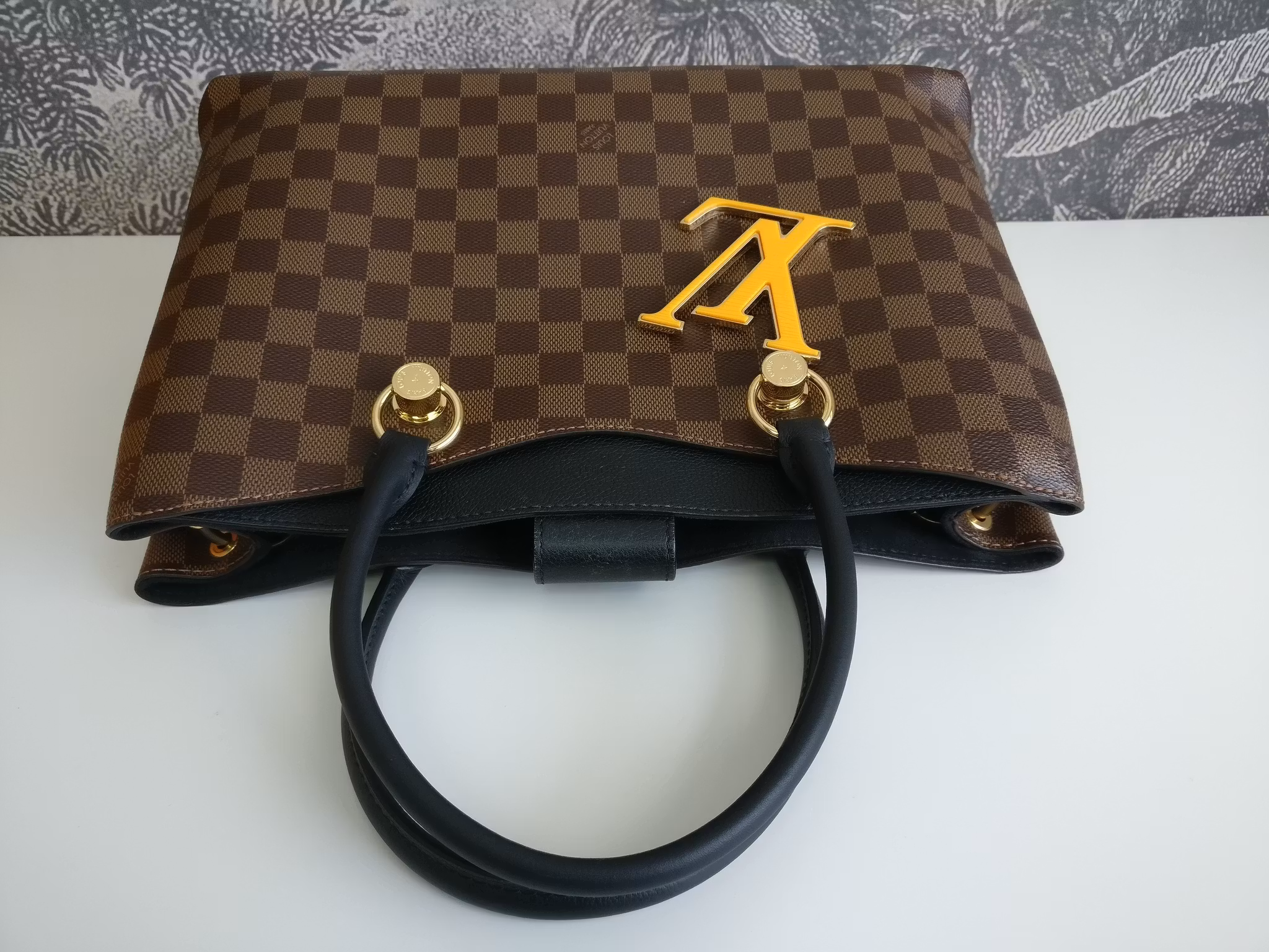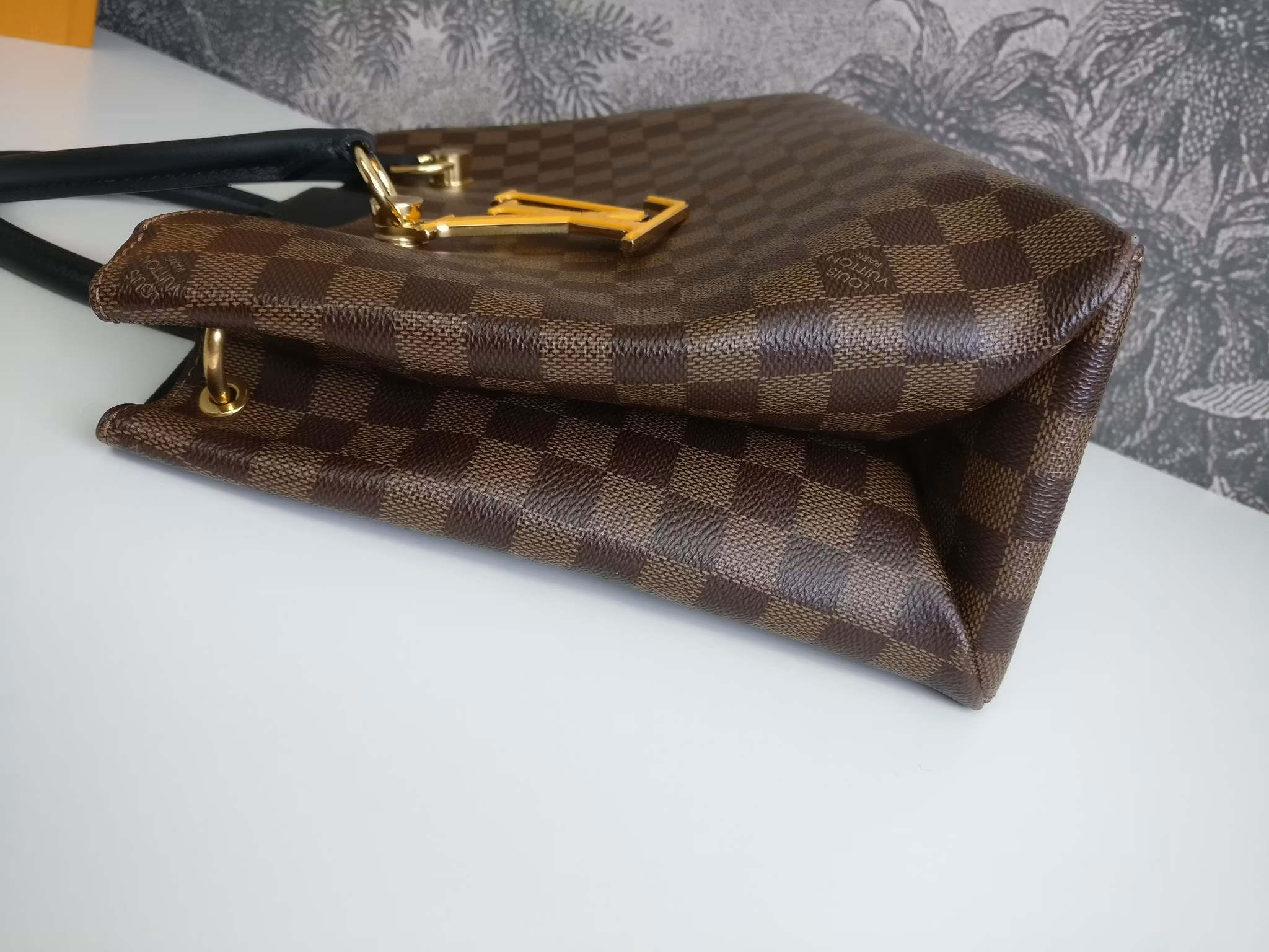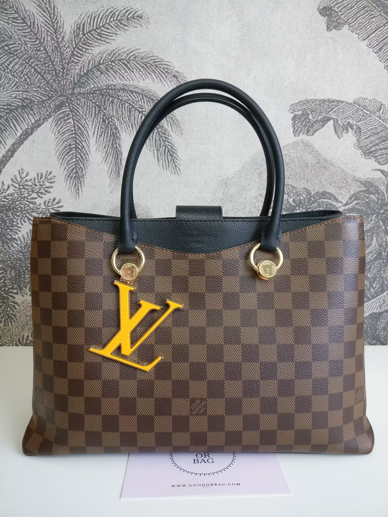 Louis Vuitton Riverside in damier ebene and black leather. Damier ebene canvas in very good condition, lower corners have moderate signs of wear such as scuffs. Handles are sturdy and in very good condition. Gold hardware in good condition with some moderate color loss. Yellow LV bag charm in the front in very good condition. The bag closes with a magnetic button in good condition with a couple of marks and scratches. Inside is lined in black alcantara. Clean inside. One pocket in the middle with a zipper which runs smoothly. Detachable shoulder strap in good condition. Comes with box (a couple of marks on the box), dust bag, detachable shoulder strap, original order confirmation, certificate of authenticity.