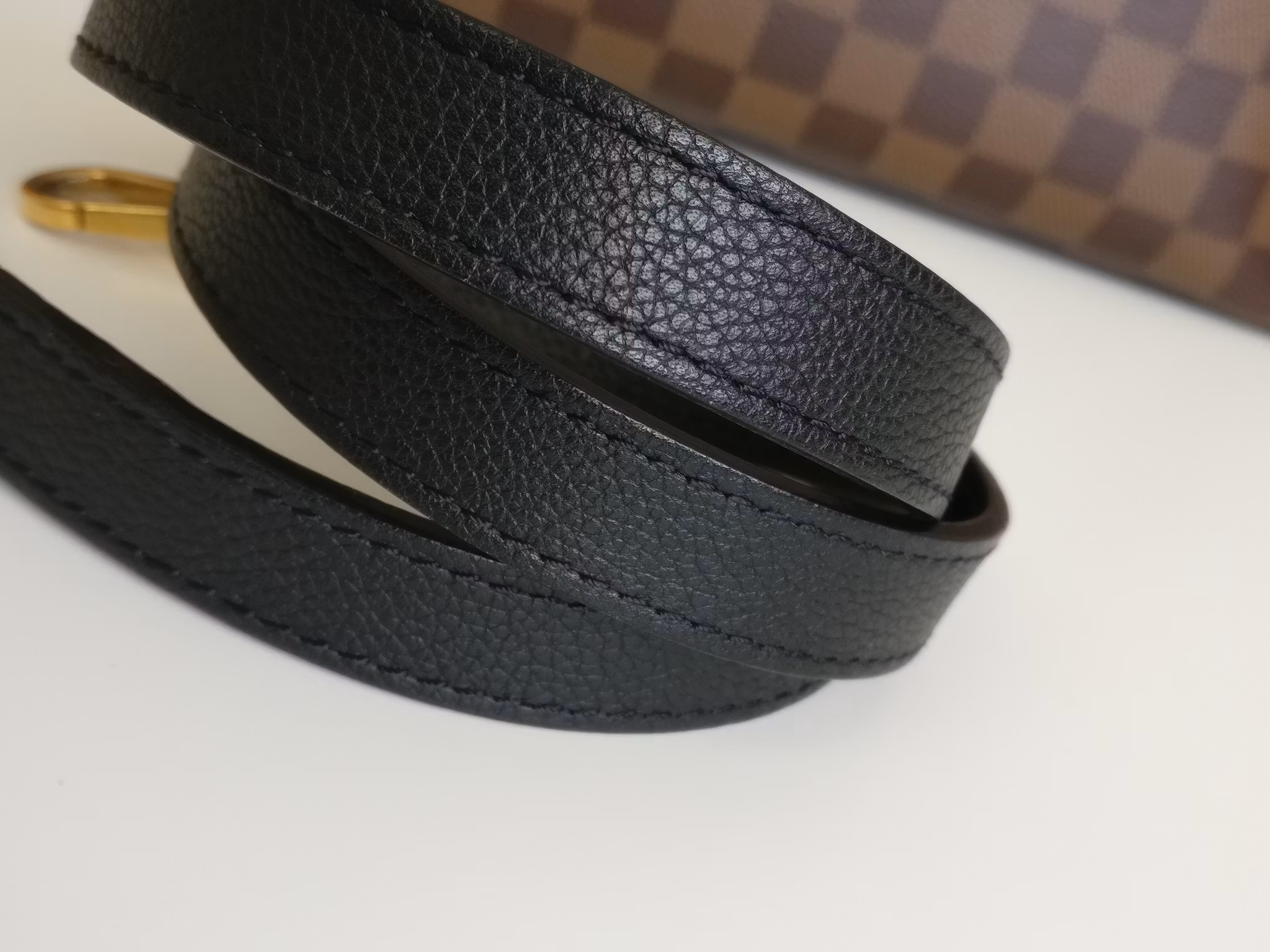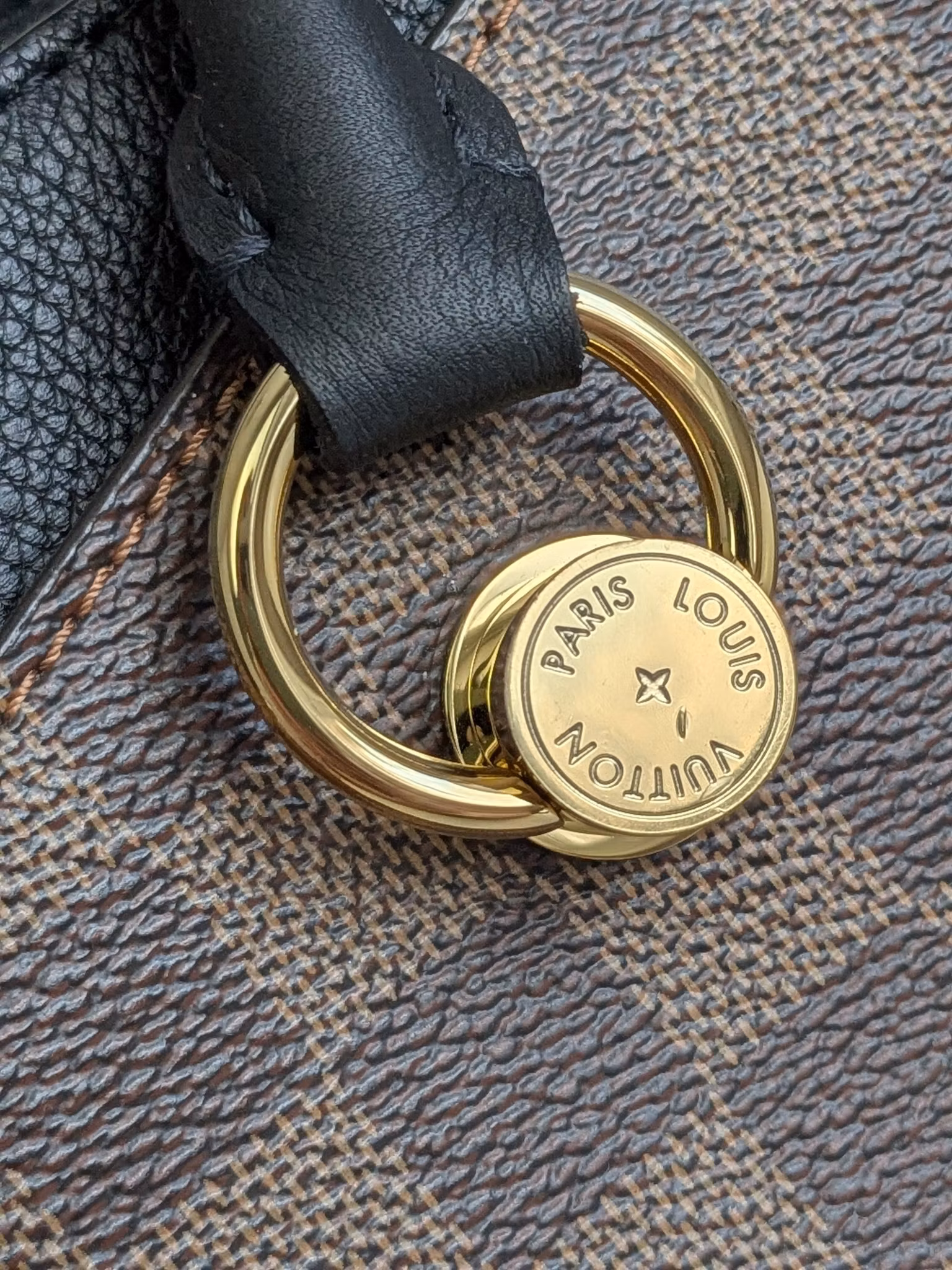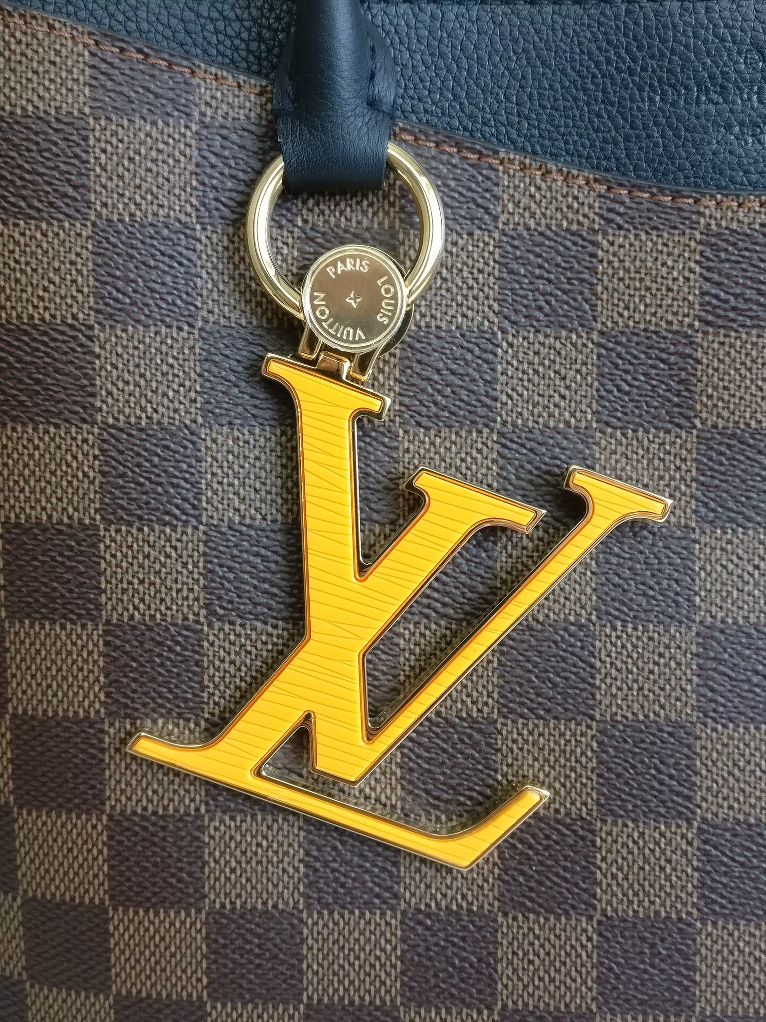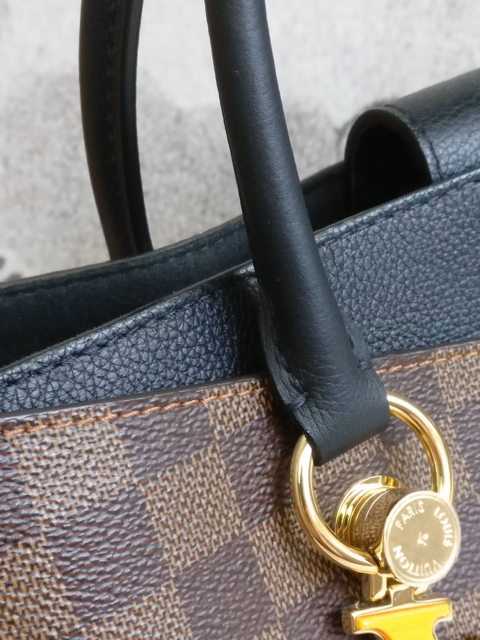 Louis Vuitton Riverside in damier ebene and black leather. Damier ebene canvas in very good condition, lower corners have moderate signs of wear such as scuffs. Handles are sturdy and in very good condition. Gold hardware in good condition with some moderate color loss. Yellow LV bag charm in the front in very good condition. The bag closes with a magnetic button in good condition with a couple of marks and scratches. Inside is lined in black alcantara. Clean inside. One pocket in the middle with a zipper which runs smoothly. Detachable shoulder strap in good condition. Comes with box (a couple of marks on the box), dust bag, detachable shoulder strap, original order confirmation, certificate of authenticity.