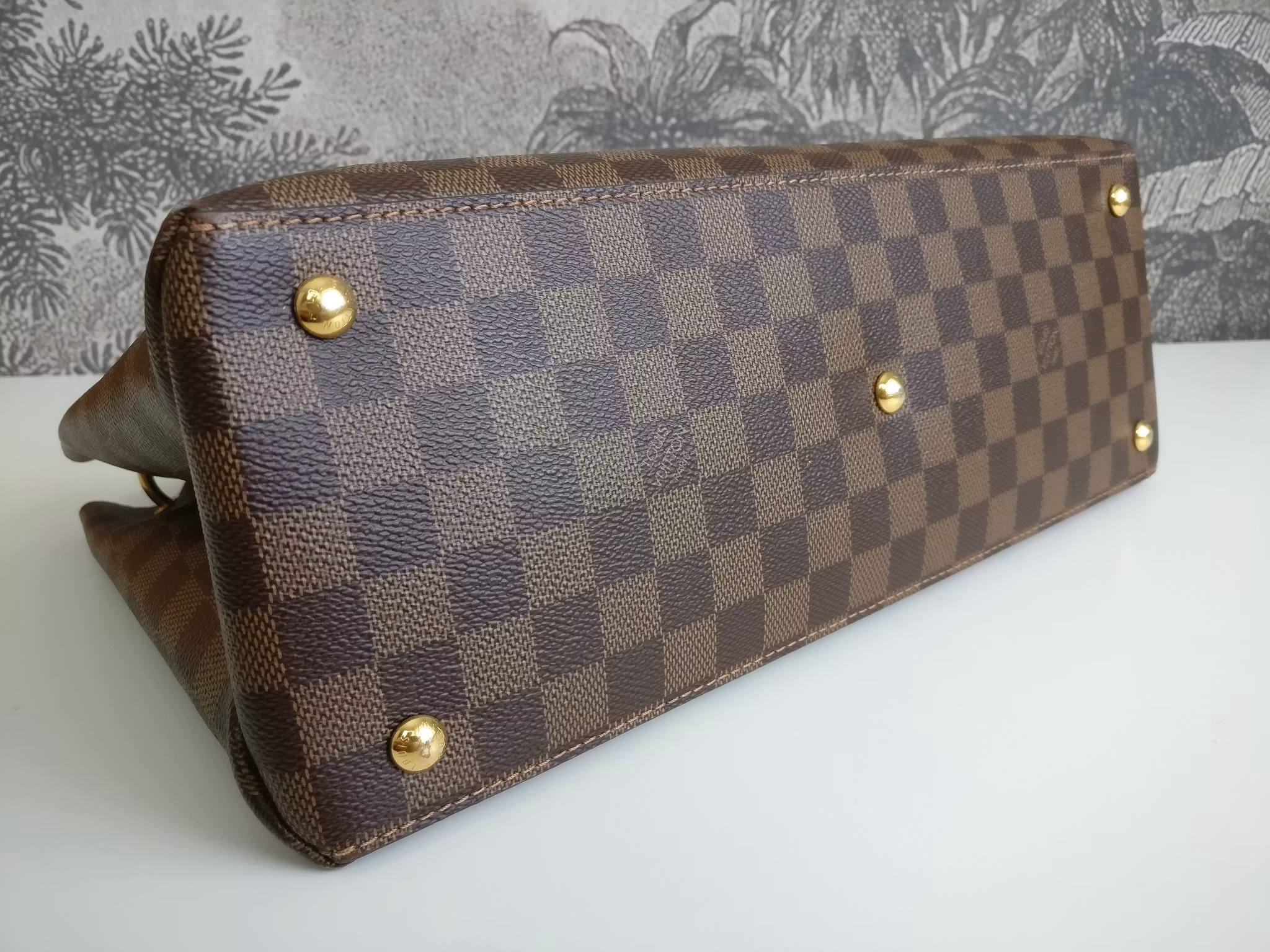 Louis Vuitton Riverside i damier ebene och svarta läderdetaljer. Damier ebene canvas i mycket fint skick, nedre hörnen har vissa bruksspår såsom skav. Botten är fin. Handtagen är stadiga och i mycket gott skick. Gold hardware i gott skick med mindre färgbortfall. Gul LV-charm framtill i utmärkt skick. Väskan stängs med magnetknapp i gott skick med lite skrapmärken på lädret. Insidan är fodrad i svart alcantara. Ren inuti. Ett extrafack med dragkedja i mitten på väskan som delar av huvudfacket, dragkedjan fungerar fint. Avtagbart axelband i gott skick. Kommer med box (några märken på boxen), dust bag, avtagbar axelrem, originalkvittens samt äkthetsintyg.