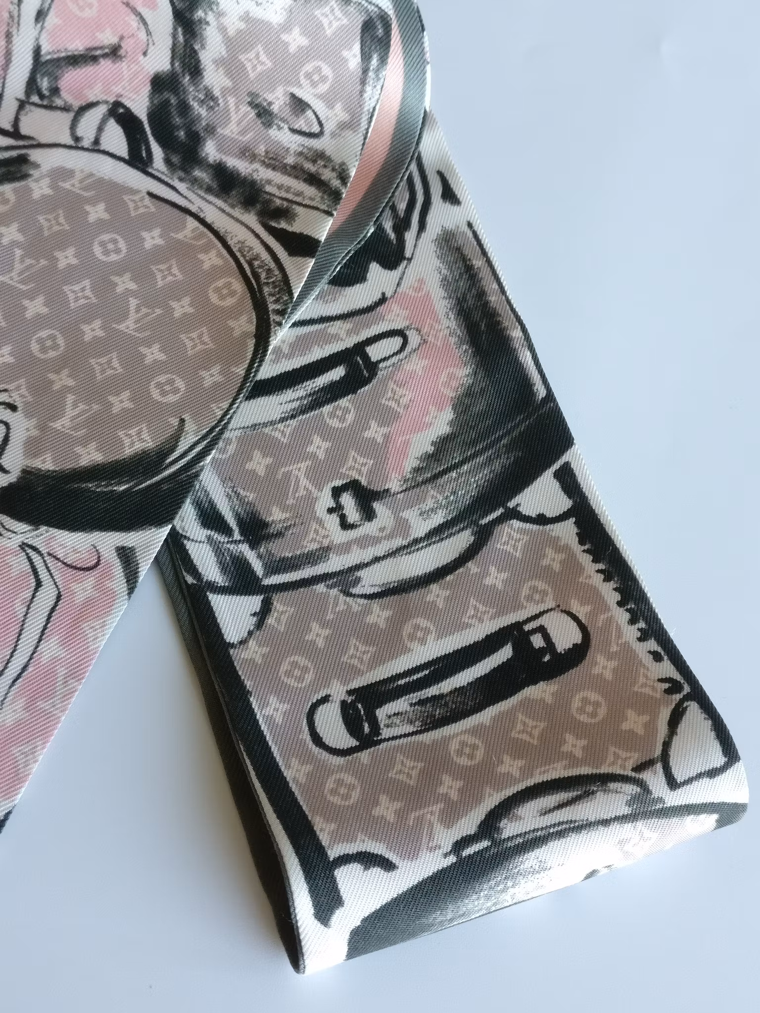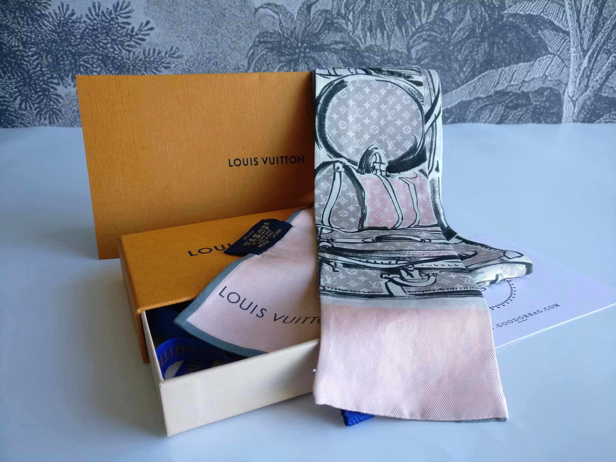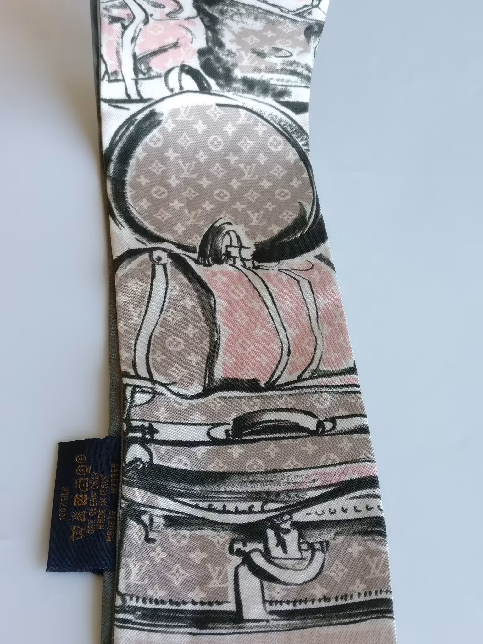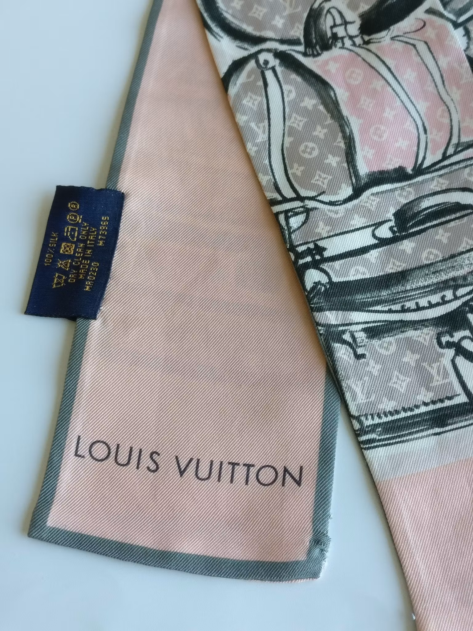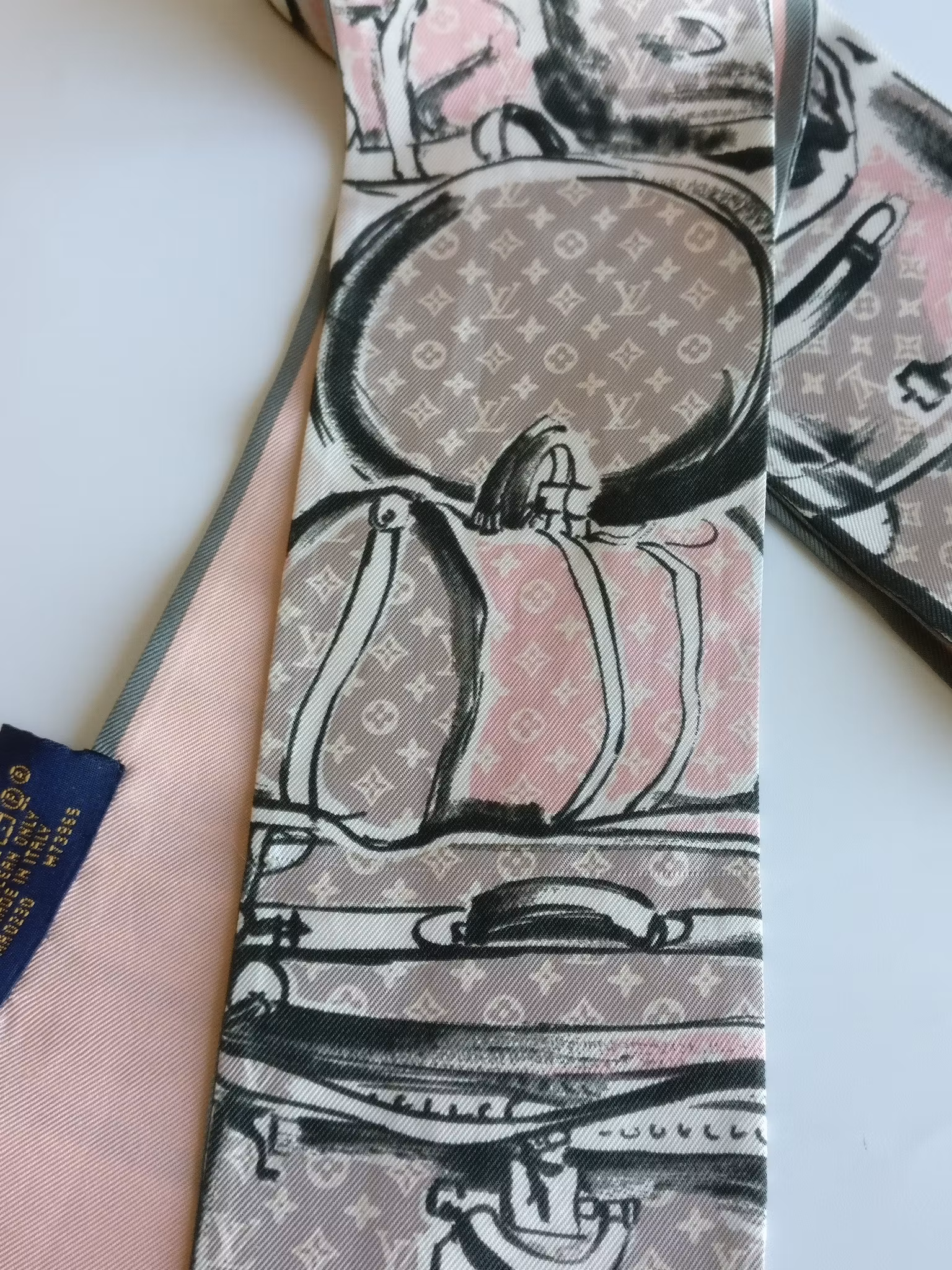 Silk bandeau Trunks rose poudre scarf i siden, print med Louis Vuittons klassiska trunkar och väskor i ljusrosa och gråbeige. I gott använt skick med små bruksspår, ingen doft. Det finns en rynka/tråddragning längst ned på kanten, vänligen se bild. Kommer med box, originalkvitto samt äkthetsintyg.